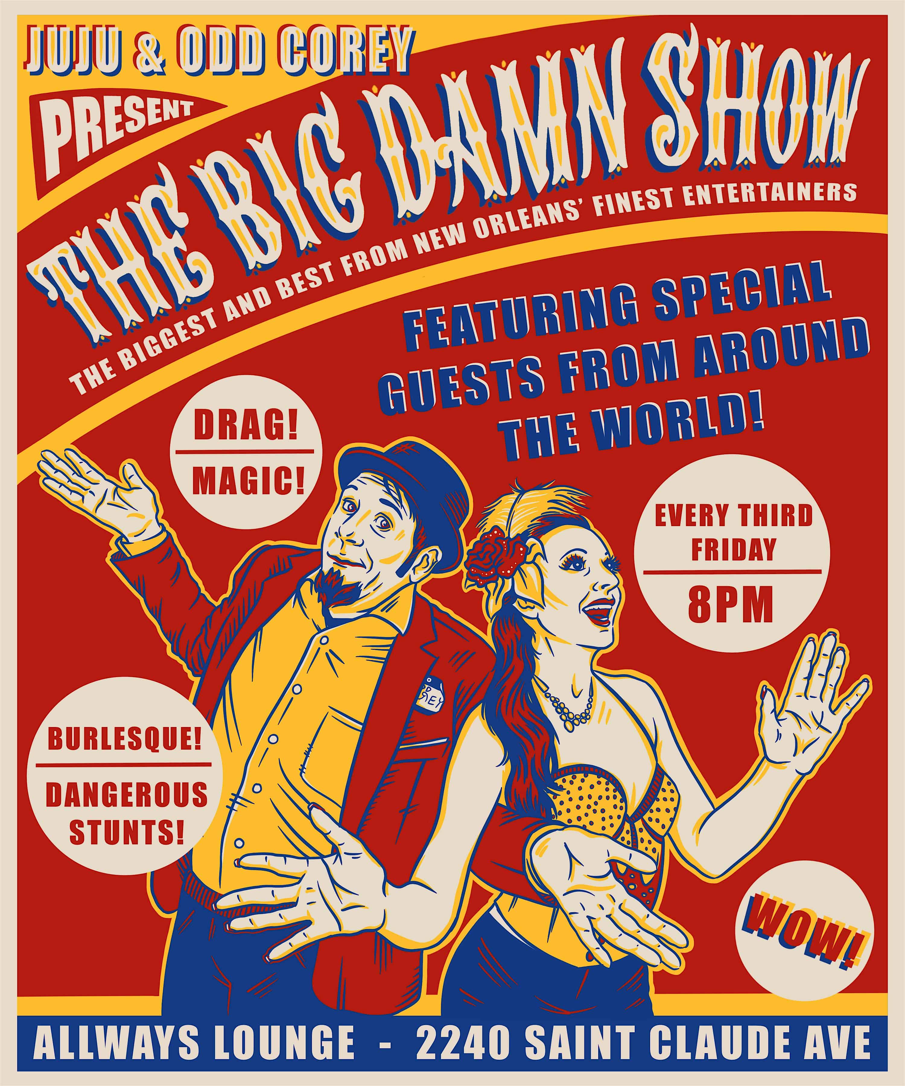 by admin14Feb The Big Damn Show at The AllWays Lounge & Cabaret – New Orleans, LA The Big Damn Show at The AllWays Lounge & Cabaret – New Orleans, LA 2 2 people viewed this event. New Orleans’ #1 comedy thrill-show featuring nationally recognized Drag & Burlesque artists, Magic Illusions,circus acts & sideshow stunts! Tickets-RSVP Link Date And Time Saturday, April 18th, 2026 01:00 AM (PST) Venue The AllWays Lounge & Cabaret Location 2240 Saint Claude Avenue, New Orleans, LA 70117 Event Types Concert or PerformancePerforming & Visual Arts Event Category LouisianaNew Orleans Share With Friends Facebook Twitter Linkedin Xing Pinterest Share This Post: