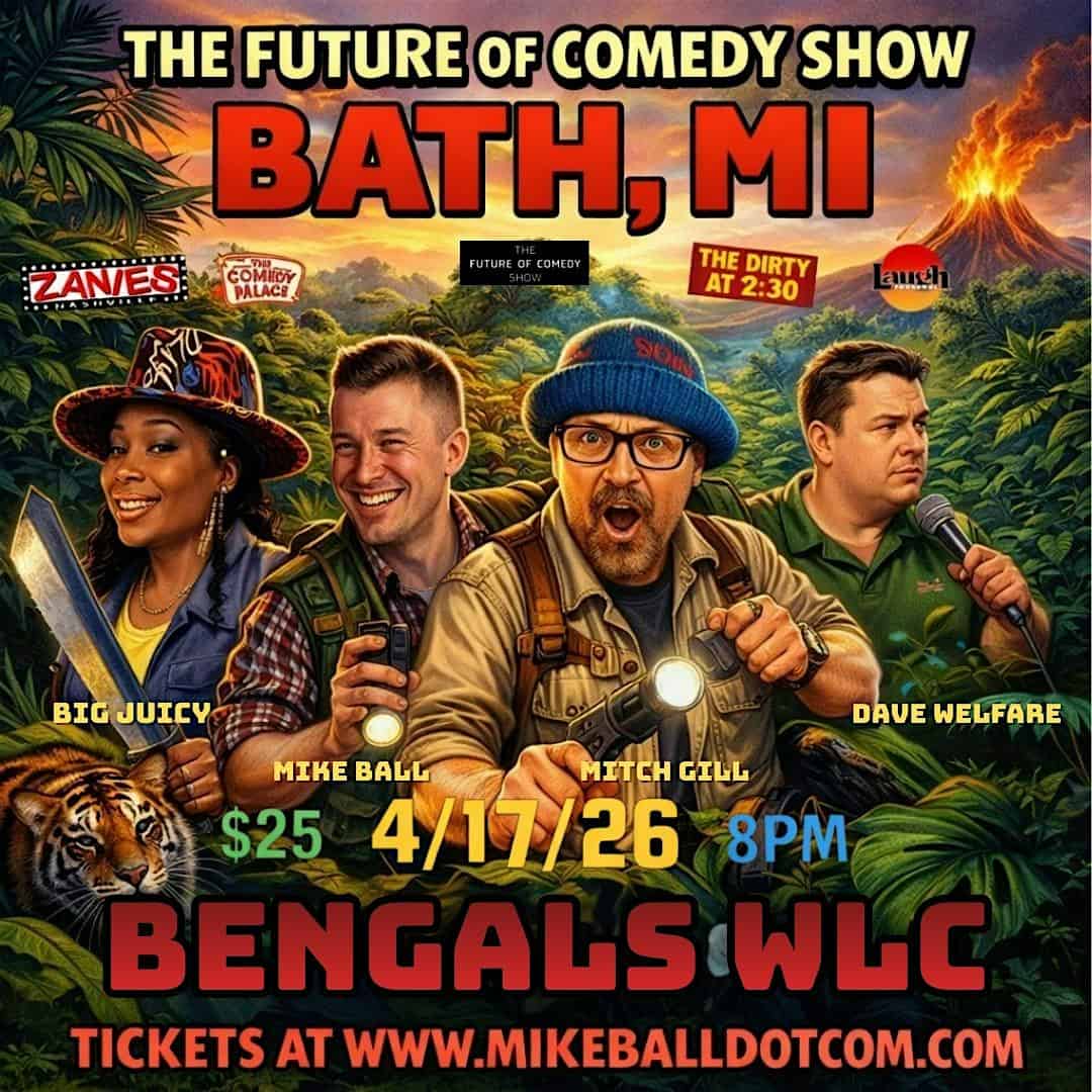 by admin14Feb The Future of Comedy Show at The Bengal Wildlife Center (Bath, MI) at Michigan Wildlife Conservancy – Bengel Wildlife – Bath Township, MI The Future of Comedy Show at The Bengal Wildlife Center (Bath, MI) at Michigan Wildlife Conservancy – Bengel Wildlife – Bath Township, MI 2 2 people viewed this event. 4 Hilarious Comedians for $25 at the BWC! Tickets-RSVP Link Date And Time Saturday, April 18th, 2026 12:00 AM (PST) Venue Michigan Wildlife Conservancy - Bengel Wildlife Location 6380 Drumheller Road, Bath Township, MI 48808 Event Types Concert or PerformancePerforming & Visual Arts Event Category Michigan Share With Friends Facebook Twitter Linkedin Xing Pinterest Share This Post: