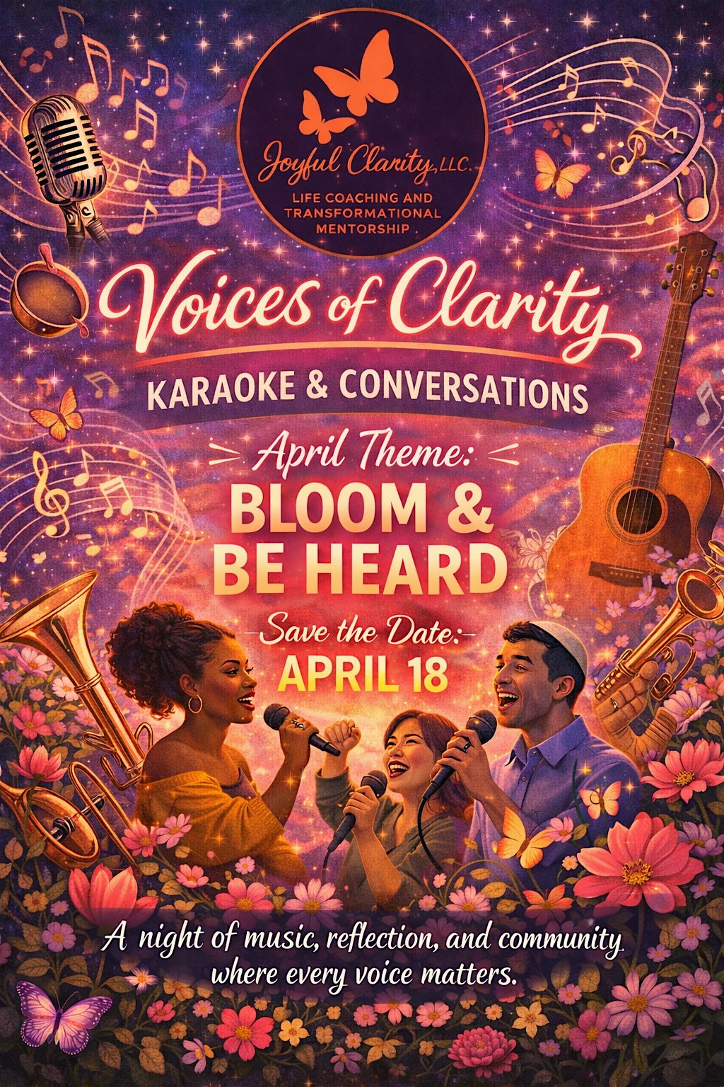 Join Joyful Clarity, LLC for an uplifting evening of music, connection, and authentic expression at Voices of Clarity: Karaoke & Conversations. This unique community gathering blends the joy of karaoke with meaningful dialogue, creating a space where individuals can relax, sing, reflect, and share in a supportive environment.