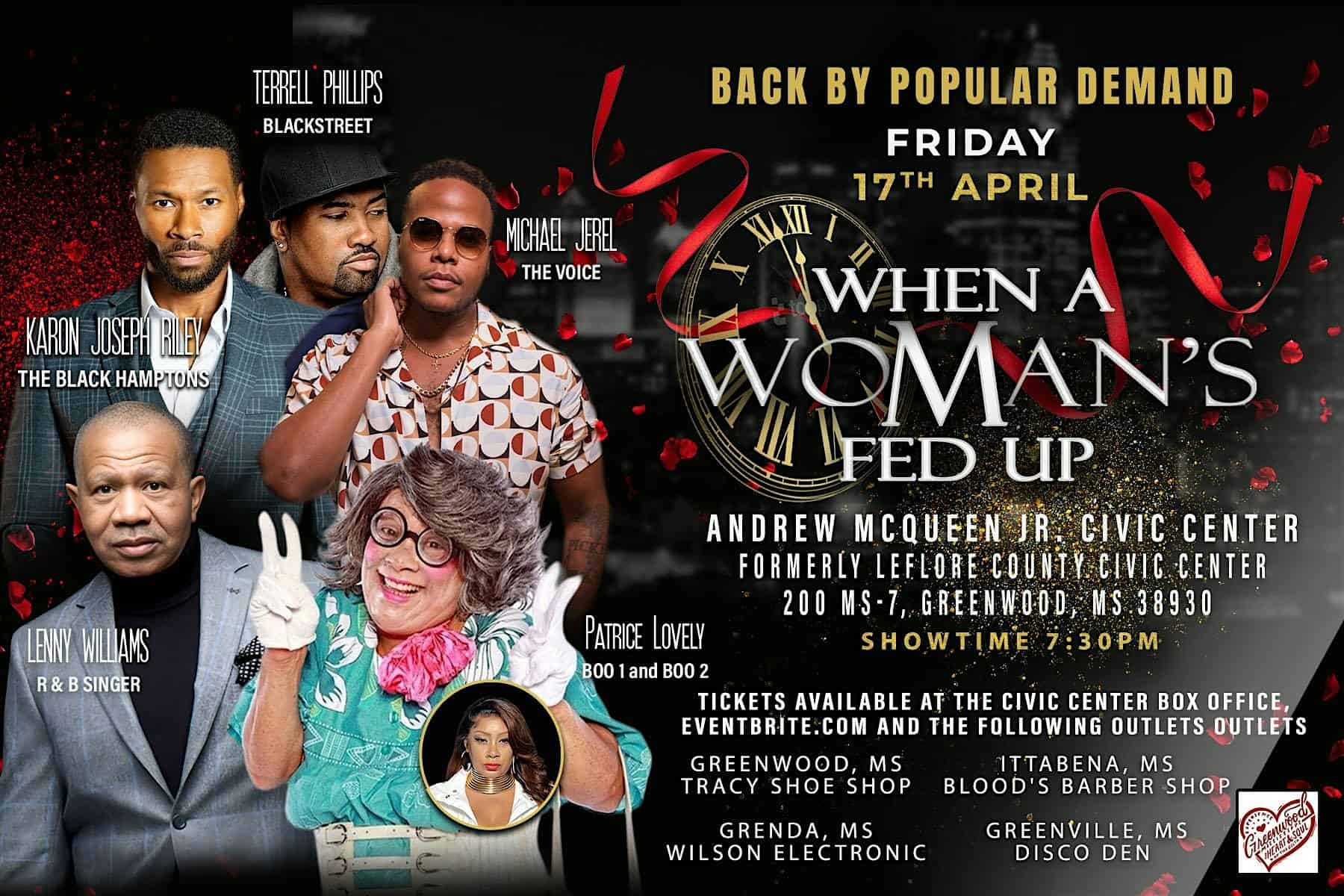 by admin14Feb When A Woman’s Fed Up Stage Play-Greenwood, MS at Leflore County Civic Center – Greenwood, MS When A Woman’s Fed Up Stage Play-Greenwood, MS at Leflore County Civic Center – Greenwood, MS 2 2 people viewed this event. Back By Popular Demand!! We’re coming back Greenwood, Mississippi! If you missed it the last time, here’s your chance! Tickets-RSVP Link Date And Time Saturday, April 18th, 2026 12:00 AM (PST) Venue Leflore County Civic Center Location 200 Mississippi 7, Greenwood, MS 38930 Event Types Concert or PerformancePerforming & Visual Arts Event Category Mississippi Share With Friends Facebook Twitter Linkedin Xing Pinterest Share This Post: