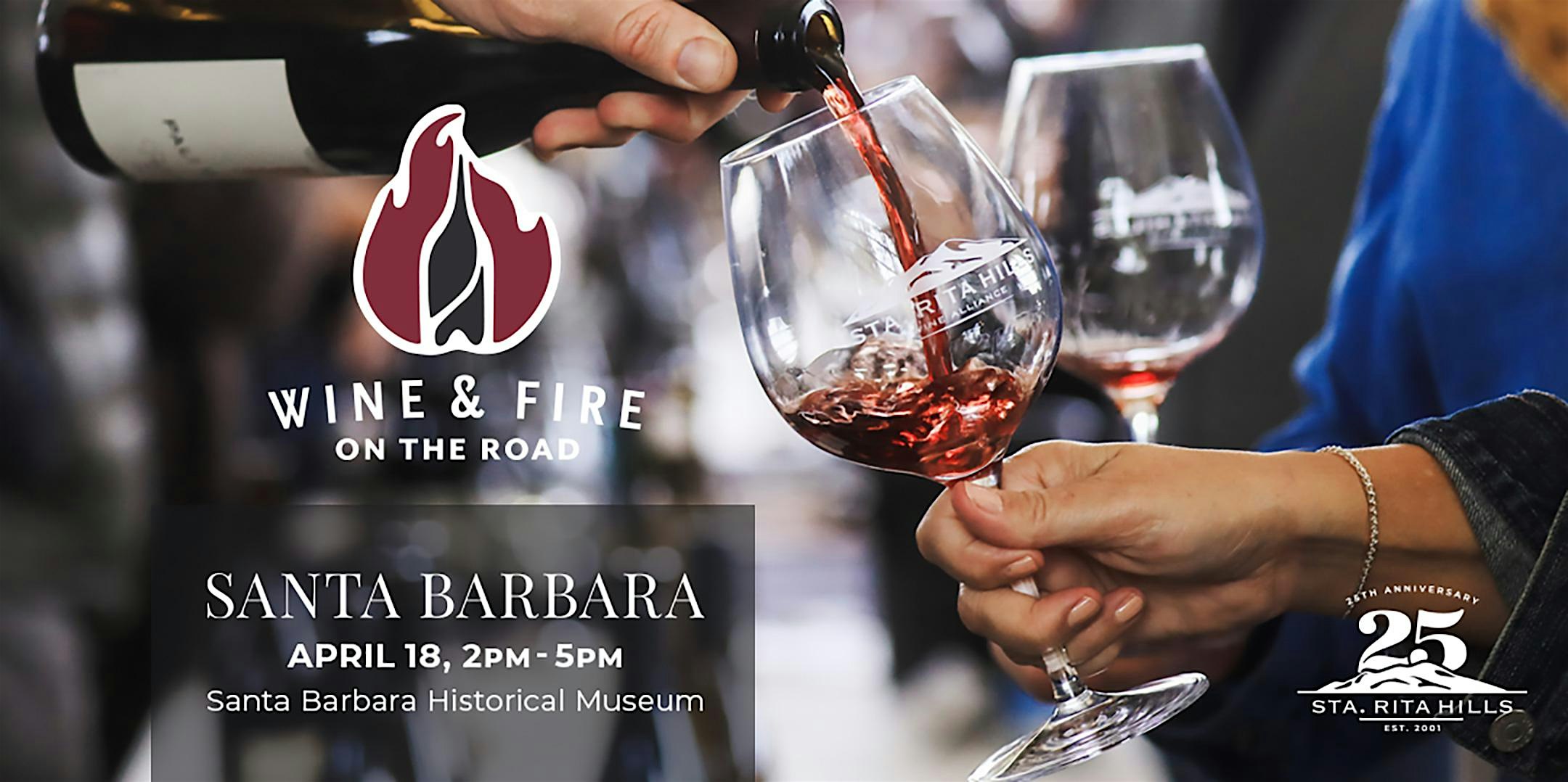by admin27Feb Wine & Fire On The Road in Santa Barbara at Santa Barbara Historical Museum – Santa Barbara, CA Wine & Fire On The Road in Santa Barbara at Santa Barbara Historical Museum – Santa Barbara, CA 3 3 people viewed this event. The Sta. Rita Hills Wine Alliance’s Spring Tasting, Wine & Fire On The Road Santa Barbara, at the Santa Barbara Historical Museum. Tickets-RSVP Link Date And Time Saturday, April 18th, 2026 @ 02:00 PM Location 136 East De La Guerra Street, Santa Barbara, CA 93101 Event Types Festival or FairFood & Drink Event Category California Share With Friends Facebook Twitter Linkedin Xing Pinterest Share This Post: