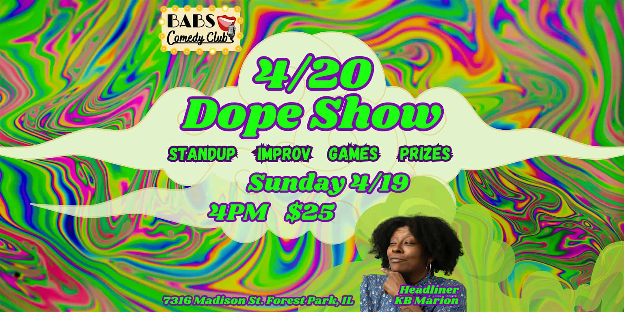 by admin14Feb 4/20 Dope Show- A Comedy Show For Stoners at BABS Comedy Club – Forest Park, IL 4/20 Dope Show- A Comedy Show For Stoners at BABS Comedy Club – Forest Park, IL 1 1 people viewed this event. Celebrate your favorite “bud” with this hilarious multimedia show: standup, improv, & audience games created for stoners, by stoners 😉 Tickets-RSVP Link Date And Time Sunday, April 19th, 2026 09:00 PM (PST) Venue BABS Comedy Club Location 7316 Madison Street, Forest Park, IL 60130 Event Types Concert or PerformancePerforming & Visual Arts Event Category Illinois Share With Friends Facebook Twitter Linkedin Xing Pinterest Share This Post: