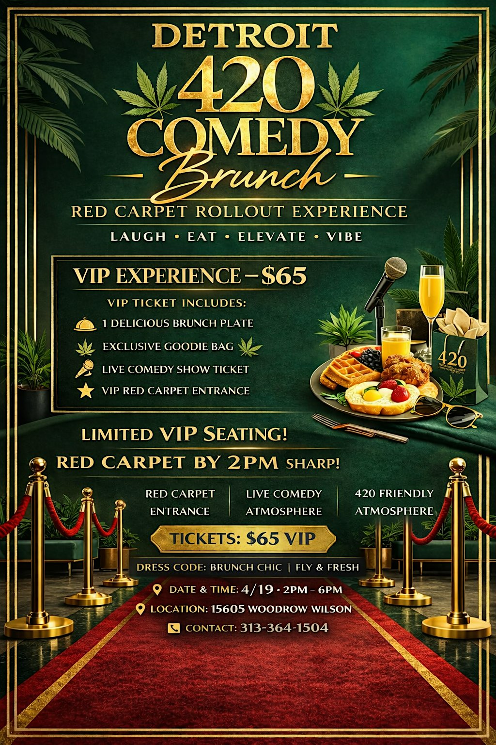 420 COMEDY BRUNCH at 15605 Woodrow Wilson St – Detroit, MI 420 COMEDY BRUNCH at 15605 Woodrow Wilson St – Detroit, MI 3 3 people viewed this event. The last Show! Sold out over 4 years. Thee 420 Comedy Brunch catered by Chef hosted by some of Detroit, finest comedians and vendors Tickets-RSVP Link Register for event Date And Time Sunday, April 19th, 2026 @ 02:00 PM Location 15605 Woodrow Wilson St 15605 Woodrow Wilson Street, Detroit, MI 48238 Event Types Food & DrinkParty or Social Gathering Event Category DetroitMichigan Share With Friends Facebook Twitter Linkedin Xing Pinterest