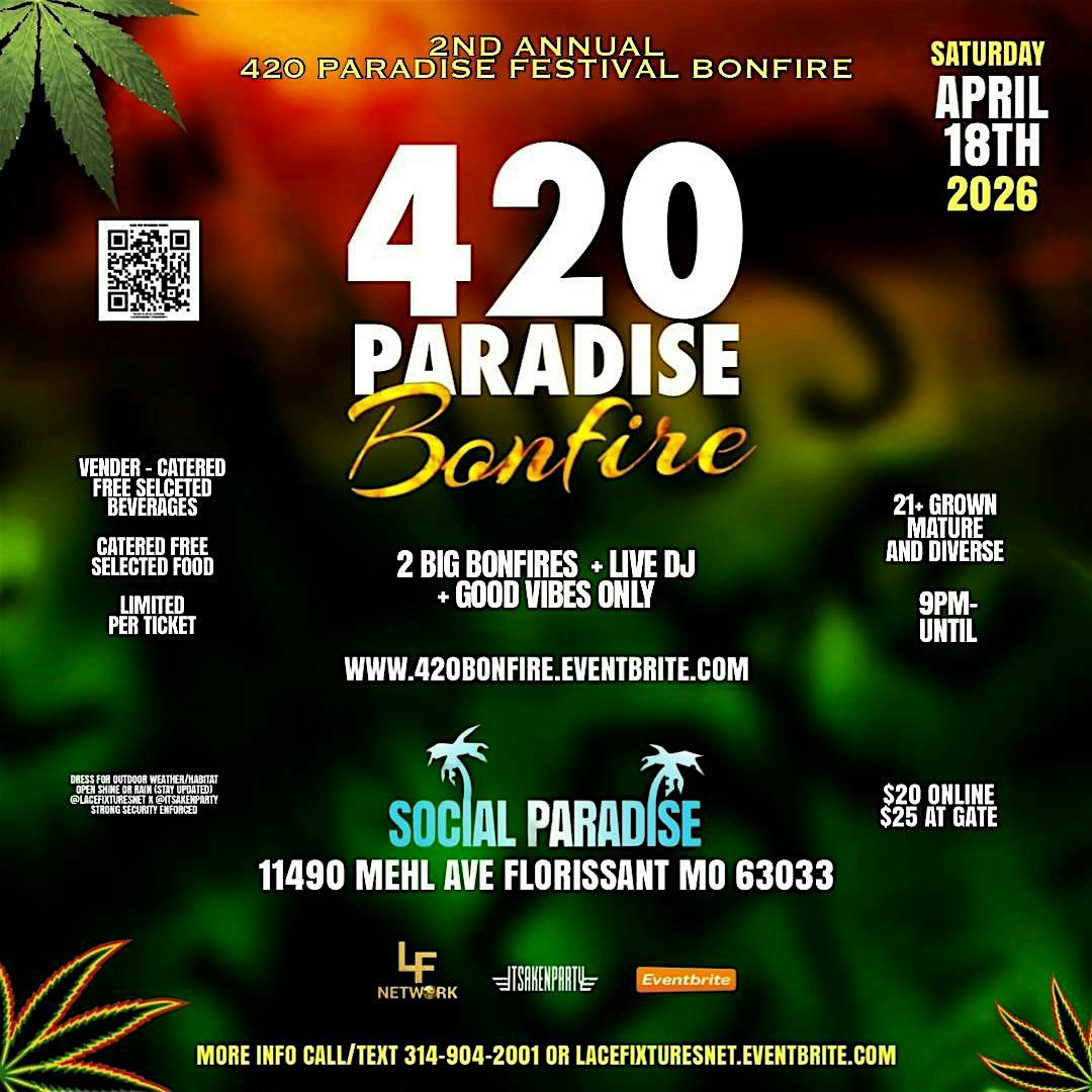 by admin13Feb 420 PARADISE FESTIVAL BONFIRE at SOCIAL PARADISE – St. Louis, MO 420 PARADISE FESTIVAL BONFIRE at SOCIAL PARADISE – St. Louis, MO 1 1 people viewed this event. 21+ Grown & Elegant Exclusive OutDoor Experience! Catered Selected Food, Catered Selected Beverages, Diversity, Sounds & more! Tickets-RSVP Link Date And Time Sunday, April 19th, 2026 01:00 AM (PST) Venue SOCIAL PARADISE Location 11490 MEHL AVE, St. Louis, MO 63033 Event Types Party or Social GatheringSeasonal & Holiday Event Category MissouriSt. Louis Share With Friends Facebook Twitter Linkedin Xing Pinterest Share This Post: