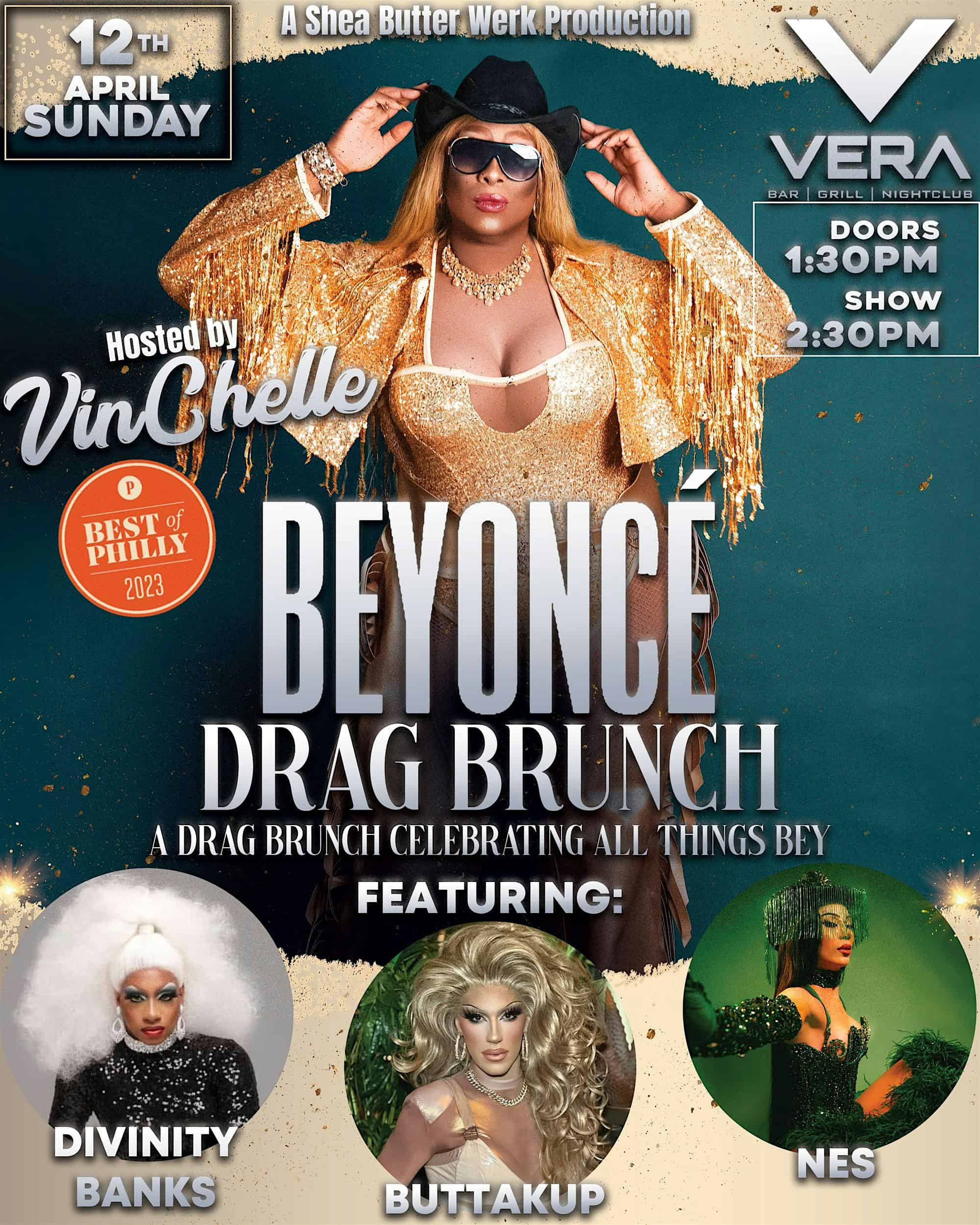 by admin14Feb Beyoncé Drag Brunch! at Vera Cherry Hill – Cherry Hill, NJ Beyoncé Drag Brunch! at Vera Cherry Hill – Cherry Hill, NJ 1 1 people viewed this event. Hosted by Vinchelle! Tickets-RSVP Link Date And Time Sunday, April 19th, 2026 06:00 PM (PST) Venue Vera Cherry Hill Location 2310 Marlton Pike West, Cherry Hill, NJ 8002 Event Types Concert or PerformancePerforming & Visual Arts Event Category New Jersey Share With Friends Facebook Twitter Linkedin Xing Pinterest Share This Post: