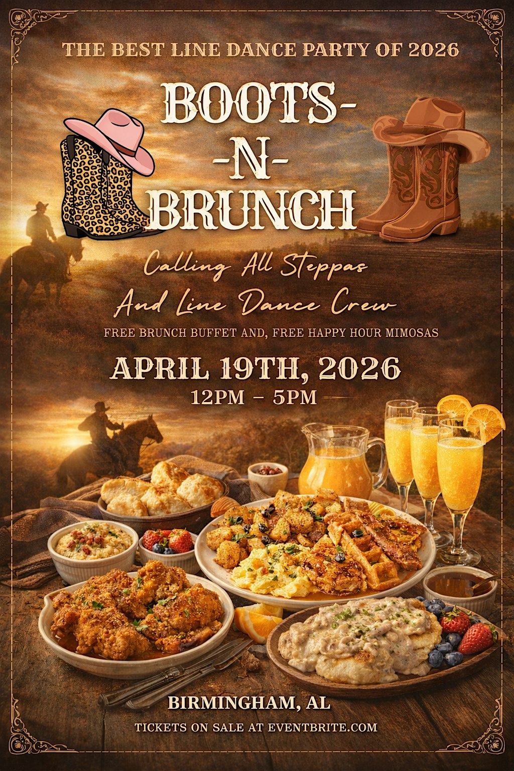 by admin13Feb Boots n Brunch. LINE DANCE DAY PARTY at 7001 Crestwood Blvd – Birmingham, AL Boots n Brunch. LINE DANCE DAY PARTY at 7001 Crestwood Blvd – Birmingham, AL 2 2 people viewed this event. Kick off your boots and join the ultimate line dance day party with brunch, beats, and good vibes! Tickets-RSVP Link Date And Time Sunday, April 19th, 2026 05:00 PM (PST) Venue 7001 Crestwood Blvd Location 7001 Crestwood Boulevard, Birmingham, AL 35210 Event Types MusicParty or Social Gathering Event Category AlabamaBirmingham Share With Friends Facebook Twitter Linkedin Xing Pinterest Share This Post: