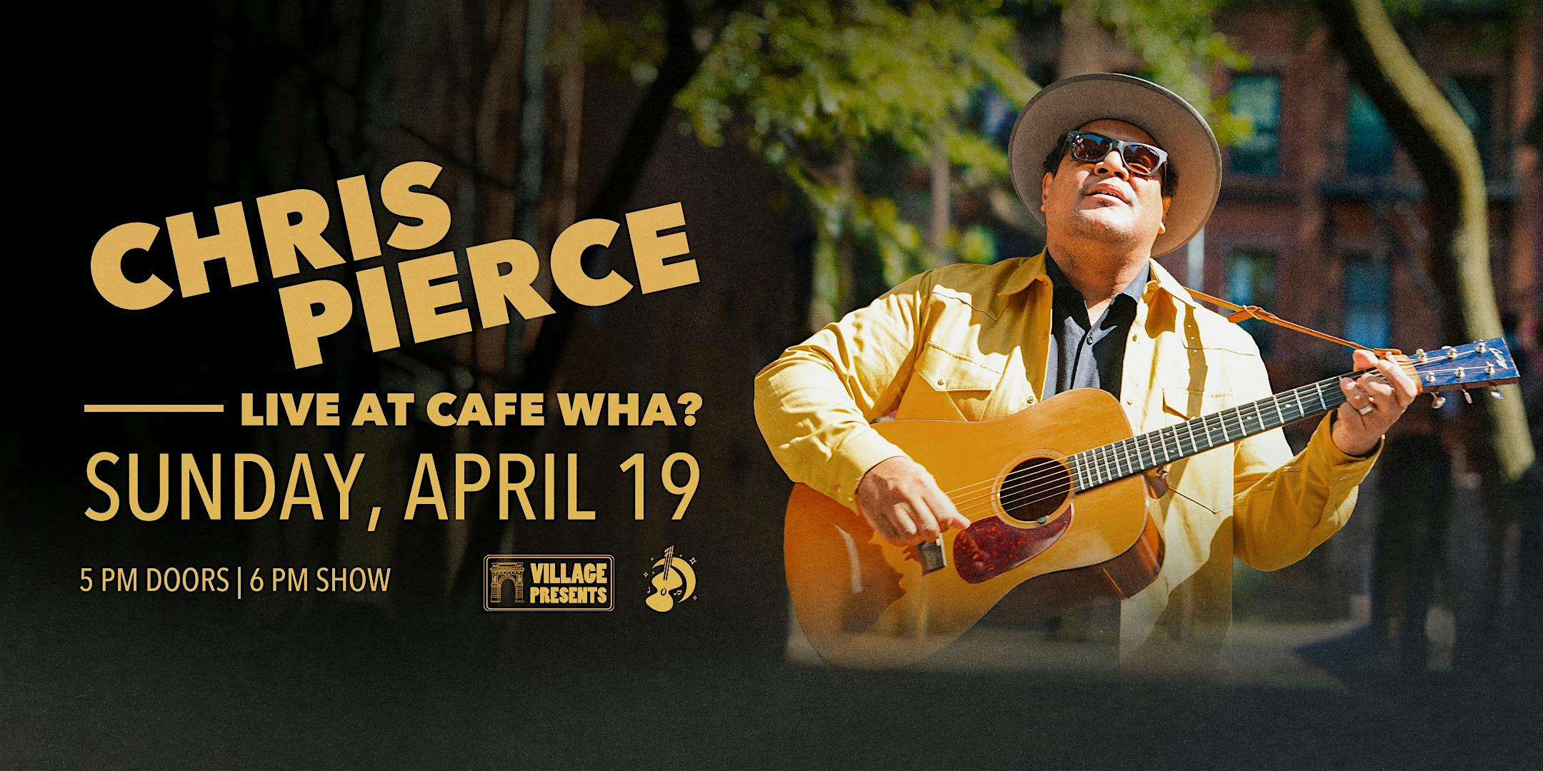 by admin13Feb Chris Pierce at Cafe Wha? – New York, NY Chris Pierce at Cafe Wha? – New York, NY 2 2 people viewed this event. Chris Pierce Live at Cafe Wha? | Sunday, April 19th | 5PM Doors, 6PM Show Tickets-RSVP Link Date And Time Sunday, April 19th, 2026 09:00 PM (PST) Venue Cafe Wha? Location 115 MacDougal Street, New York, NY 10012 Event Types Concert or PerformanceMusic Event Category New YorkNew York City Share With Friends Facebook Twitter Linkedin Xing Pinterest Share This Post: