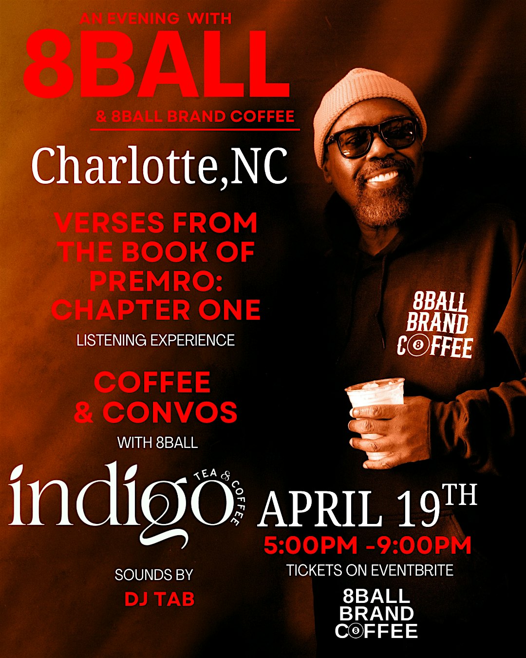 Coffee & Convo’s with 8Ball at Indigo Tea & Coffee – Charlotte, NC Coffee & Convo’s with 8Ball at Indigo Tea & Coffee – Charlotte, NC 2 2 people viewed this event. Experience this special album listening while sampling the new 8Ball Brand Coffee with 8Ball at “Indigo Tea & Coffee” Tickets-RSVP Link Register for event Date And Time Sunday, April 19th, 2026 @ 05:00 PM Location 644 North Church Street, Charlotte, NC 28202 Event Types Food & DrinkMeeting or Networking EventOther Event Category CharlotteNorth Carolina Share With Friends Facebook Twitter Linkedin Xing Pinterest