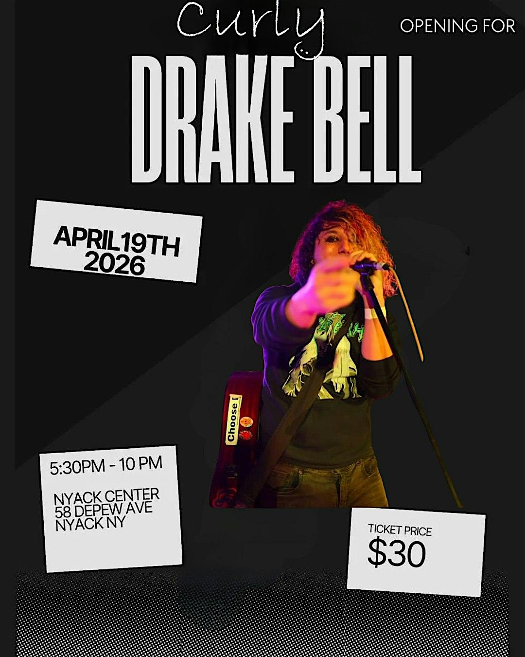 by admin27Feb Curly opening for Drake Bell at Nyack Center – Nyack, NY Curly opening for Drake Bell at Nyack Center – Nyack, NY 2 2 people viewed this event. Kick off the night with Curly warming up the crowd before Drake Bell takes the stage for a night to remember! Tickets-RSVP Link Date And Time Sunday, April 19th, 2026 @ 05:00 PM Location 58 Depew Avenue, Nyack, NY 10960 Event Types Concert or PerformanceMusic Event Category New York Share With Friends Facebook Twitter Linkedin Xing Pinterest Share This Post: