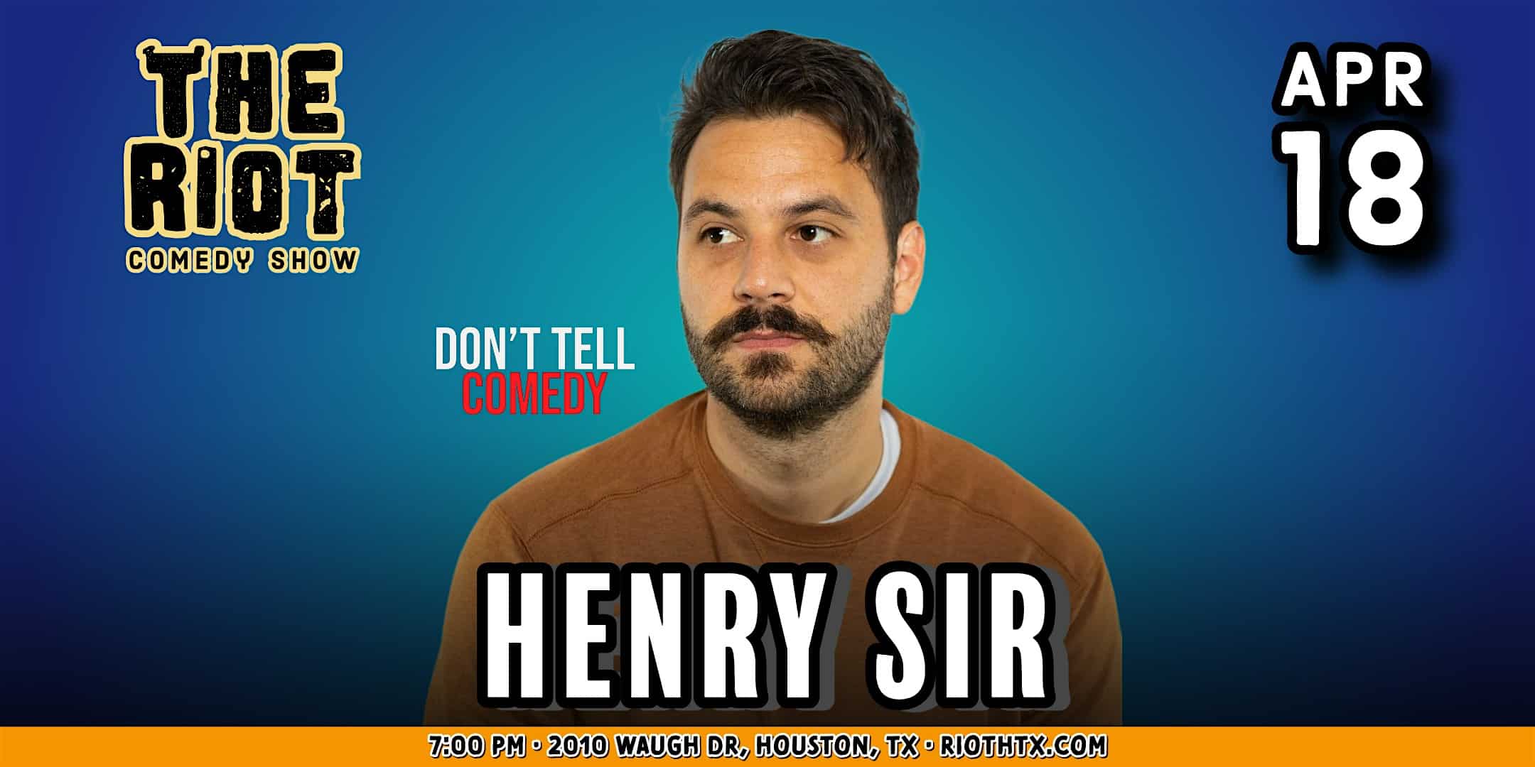 by admin14Feb Henry Sir (Don’t Tell Comedy) Headlines The Riot Comedy Club at The Riot Comedy Club upstairs at Rudyard’s – Houston, TX Henry Sir (Don’t Tell Comedy) Headlines The Riot Comedy Club at The Riot Comedy Club upstairs at Rudyard’s – Houston, TX 1 1 people viewed this event. Join us for a hilarious evening of laughter with Henry Sir at The Riot Comedy Club! Tickets-RSVP Link Date And Time Sunday, April 19th, 2026 12:00 AM (PST) Venue The Riot Comedy Club upstairs at Rudyard's Location 2010 Waugh Drive, Houston, TX 77006 Event Types Concert or PerformancePerforming & Visual Arts Event Category HoustonTexas Share With Friends Facebook Twitter Linkedin Xing Pinterest Share This Post:
