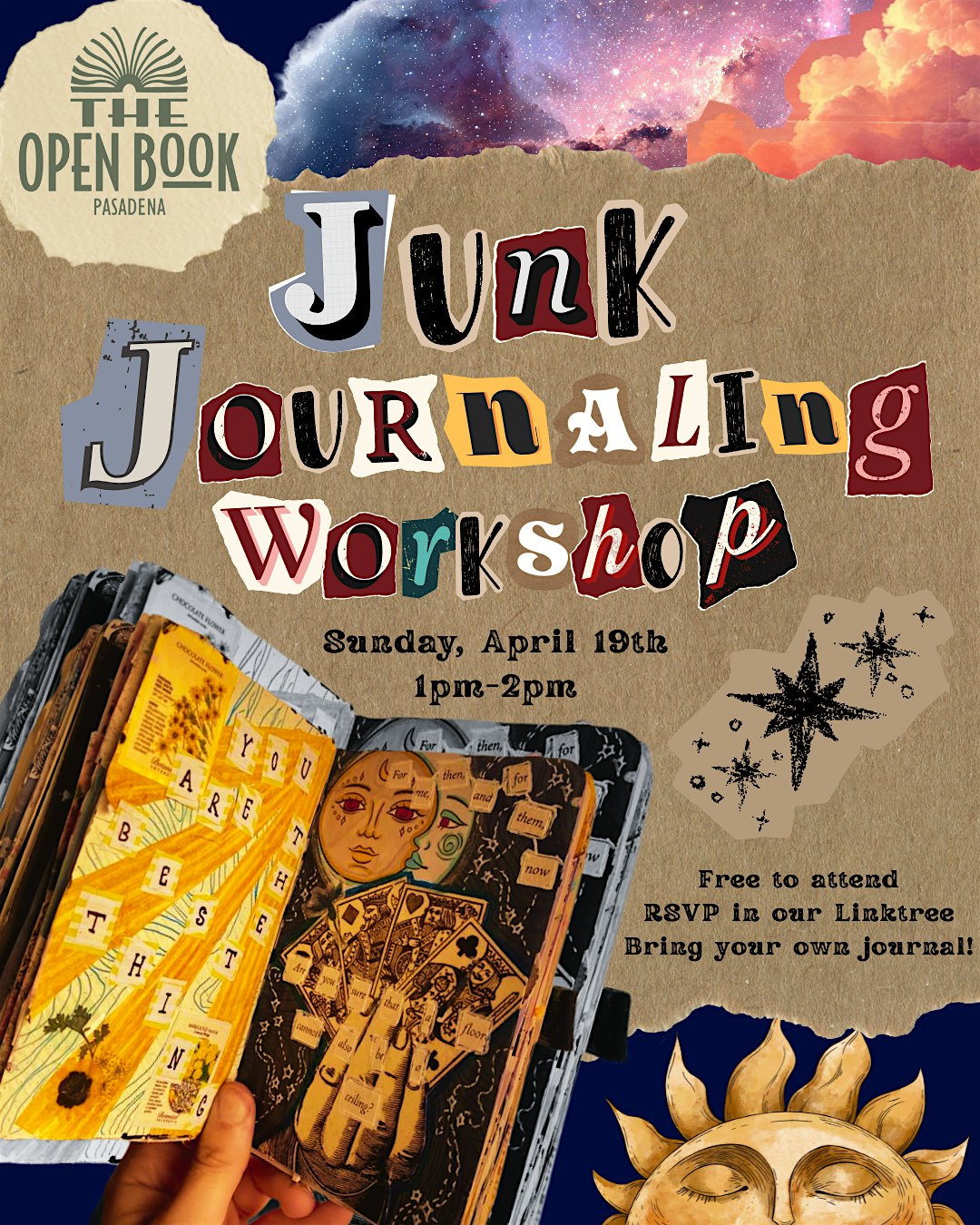 Junk Journaling Workshop at The Open Book Pasadena at 300 E Colorado Blvd #161 – Pasadena, CA Junk Journaling Workshop at The Open Book Pasadena at 300 E Colorado Blvd #161 – Pasadena, CA 2 2 people viewed this event. Bring your own journal to our Junk Journaling Workshop! Follow us on Instagram for event and store updates @theopenbook_pasadena Tickets-RSVP Link Register for event Date And Time Sunday, April 19th, 2026 @ 01:00 PM Location 300 E Colorado Blvd #161 300 East Colorado Boulevard, Pasadena, CA 91101 Event Types Class, Training, or Workshop Event Category California Share With Friends Facebook Twitter Linkedin Xing Pinterest
