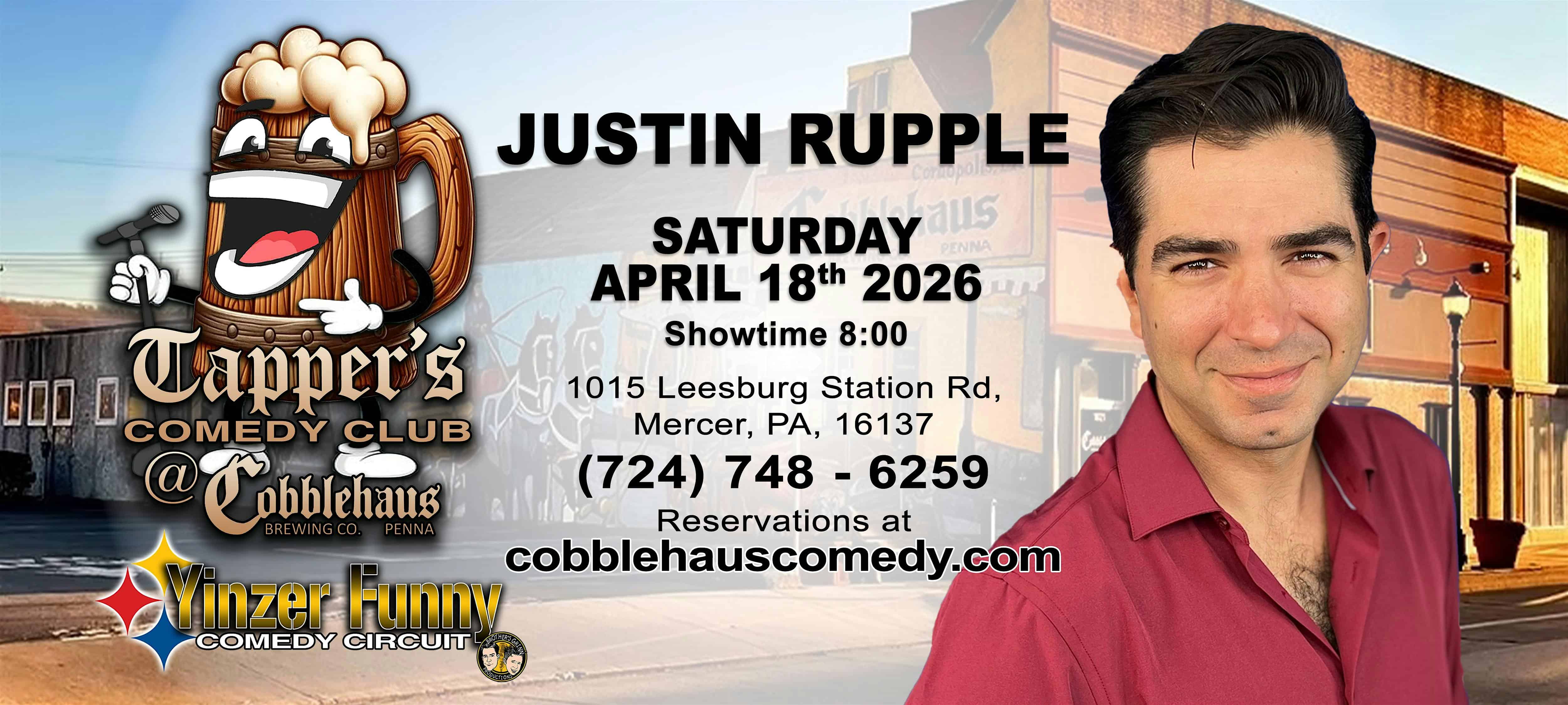 by admin14Feb JUSTIN RUPPLE – Tapper’s Comedy Club @ Cobblehaus (Mercer, PA) at Cobblehaus Brewing Company – Mercer, PA JUSTIN RUPPLE – Tapper’s Comedy Club @ Cobblehaus (Mercer, PA) at Cobblehaus Brewing Company – Mercer, PA 2 2 people viewed this event. Hollywood Funnies, and Brews with how to train your Dragon Star – Justin Rupple at Tapper’s Comedy Club in Mercer, PA – April 18, 2025 Tickets-RSVP Link Date And Time Sunday, April 19th, 2026 12:00 AM (PST) Venue Cobblehaus Brewing Company Location 1015 Leesburg Station Rd., Mercer, PA 16137 Event Types Concert or PerformancePerforming & Visual Arts Event Category Pennsylvania Share With Friends Facebook Twitter Linkedin Xing Pinterest Share This Post: