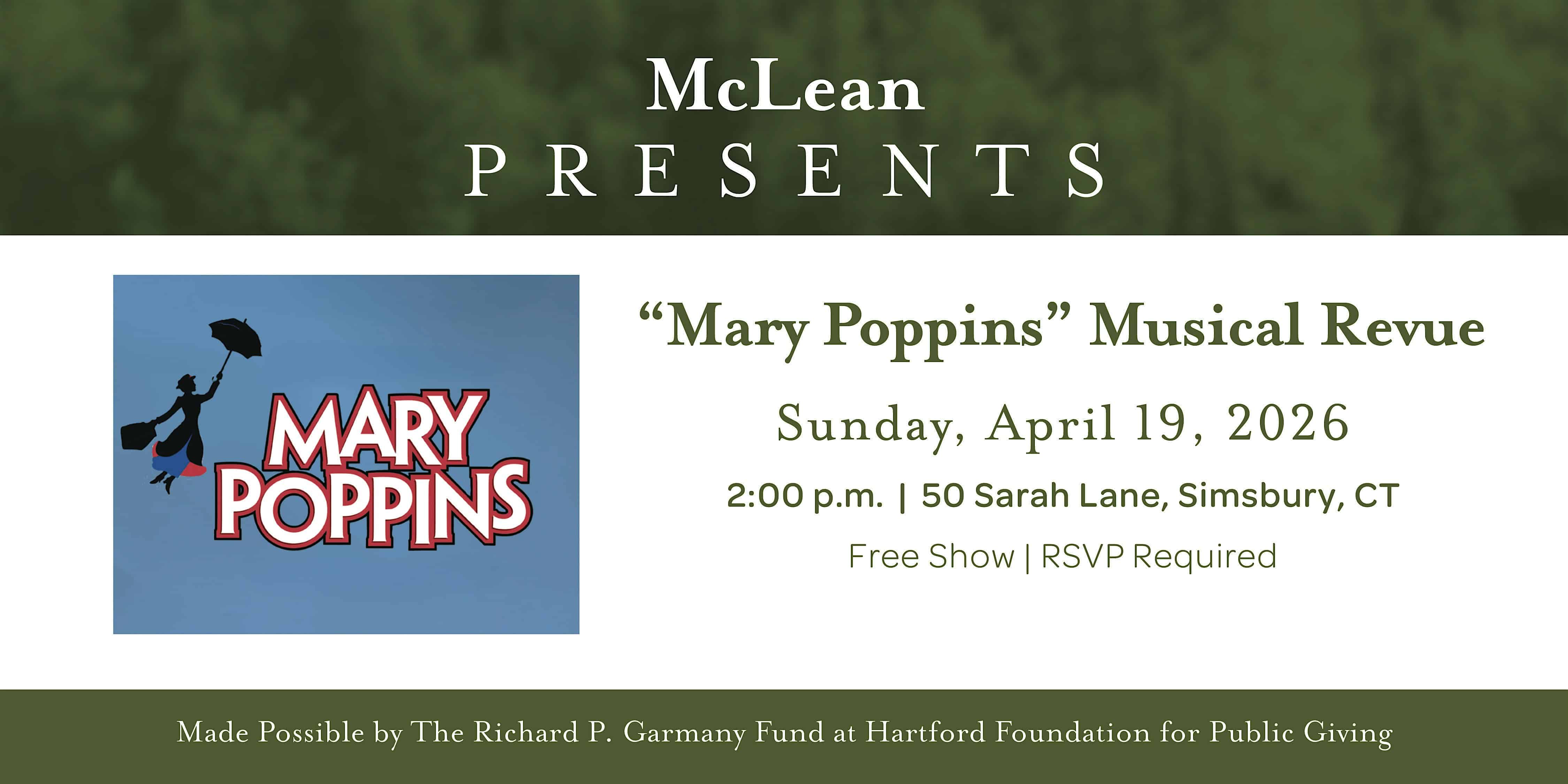 by admin14Feb McLean Presents: “Mary Poppins” Musical Revue at 50 Sarah Ln – Simsbury, CT McLean Presents: “Mary Poppins” Musical Revue at 50 Sarah Ln – Simsbury, CT 1 1 people viewed this event. Come join us – it’ll be supercalifragilisticexpialidocious! Musical revue directed by Michael Yachanin. Tickets-RSVP Link Date And Time Sunday, April 19th, 2026 06:00 PM (PST) Venue 50 Sarah Ln Location 50 Sarah Lane, Simsbury, CT 6070 Event Types Concert or PerformancePerforming & Visual Arts Event Category Connecticut Share With Friends Facebook Twitter Linkedin Xing Pinterest Share This Post: