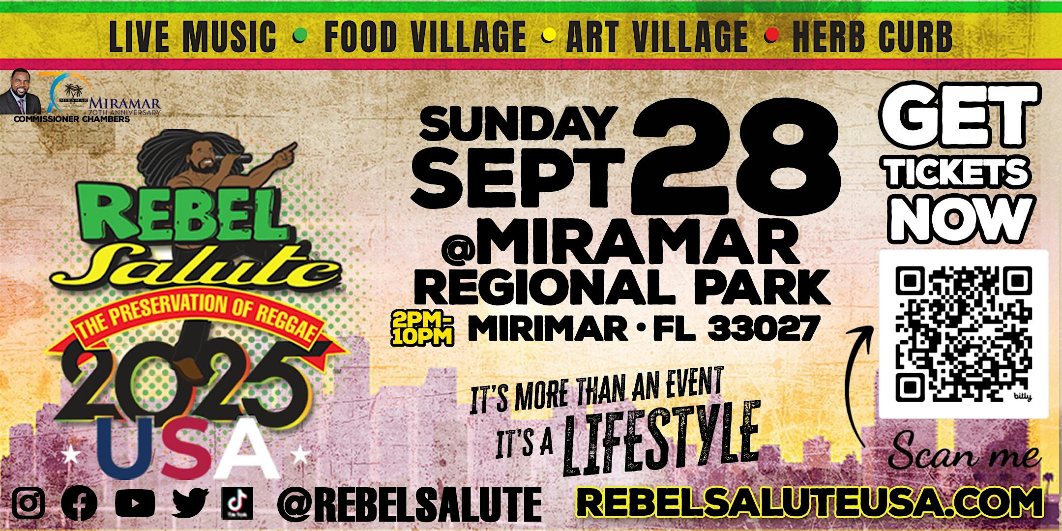 by admin13Feb REBEL SALUTE 2026 USA at Miramar Regional Park – Miramar, FL REBEL SALUTE 2026 USA at Miramar Regional Park – Miramar, FL 2 2 people viewed this event. Rebel Salute, the largest showcase of roots reggae and culturally-themed dancehall will have its inaugural celebration on April 19th, 2026 Tickets-RSVP Link Date And Time Sunday, April 19th, 2026 06:00 PM (PST) Venue Miramar Regional Park Location 16801 Miramar Parkway, Miramar, FL 33027 Event Types Concert or PerformanceMusic Event Category FloridaMiami Share With Friends Facebook Twitter Linkedin Xing Pinterest Share This Post: