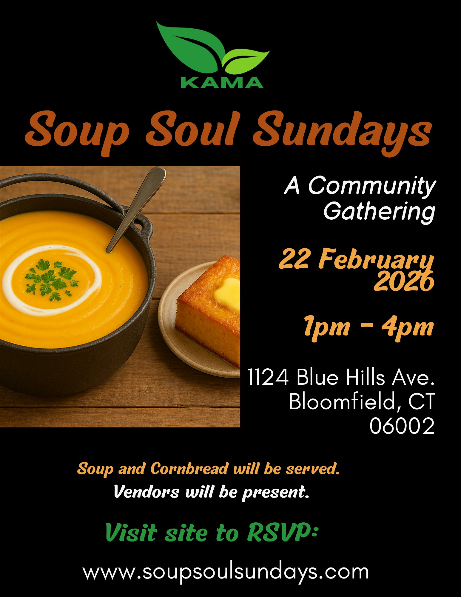 Soup Soul Sundays at 1124 Blue Hills Ave – Bloomfield, CT Soup Soul Sundays at 1124 Blue Hills Ave – Bloomfield, CT 3 3 people viewed this event. Soup Soul Sundays is a vibrant community-driven culinary event hosted by Kama Cafe Community Park. Tickets-RSVP Link Register for event Date And Time Sunday, April 19th, 2026 @ 01:00 PM Location 1124 Blue Hills Avenue, Bloomfield, CT 6002 Event Types Community & CultureParty or Social Gathering Event Category ConnecticutHartford Share With Friends Facebook Twitter Linkedin Xing Pinterest