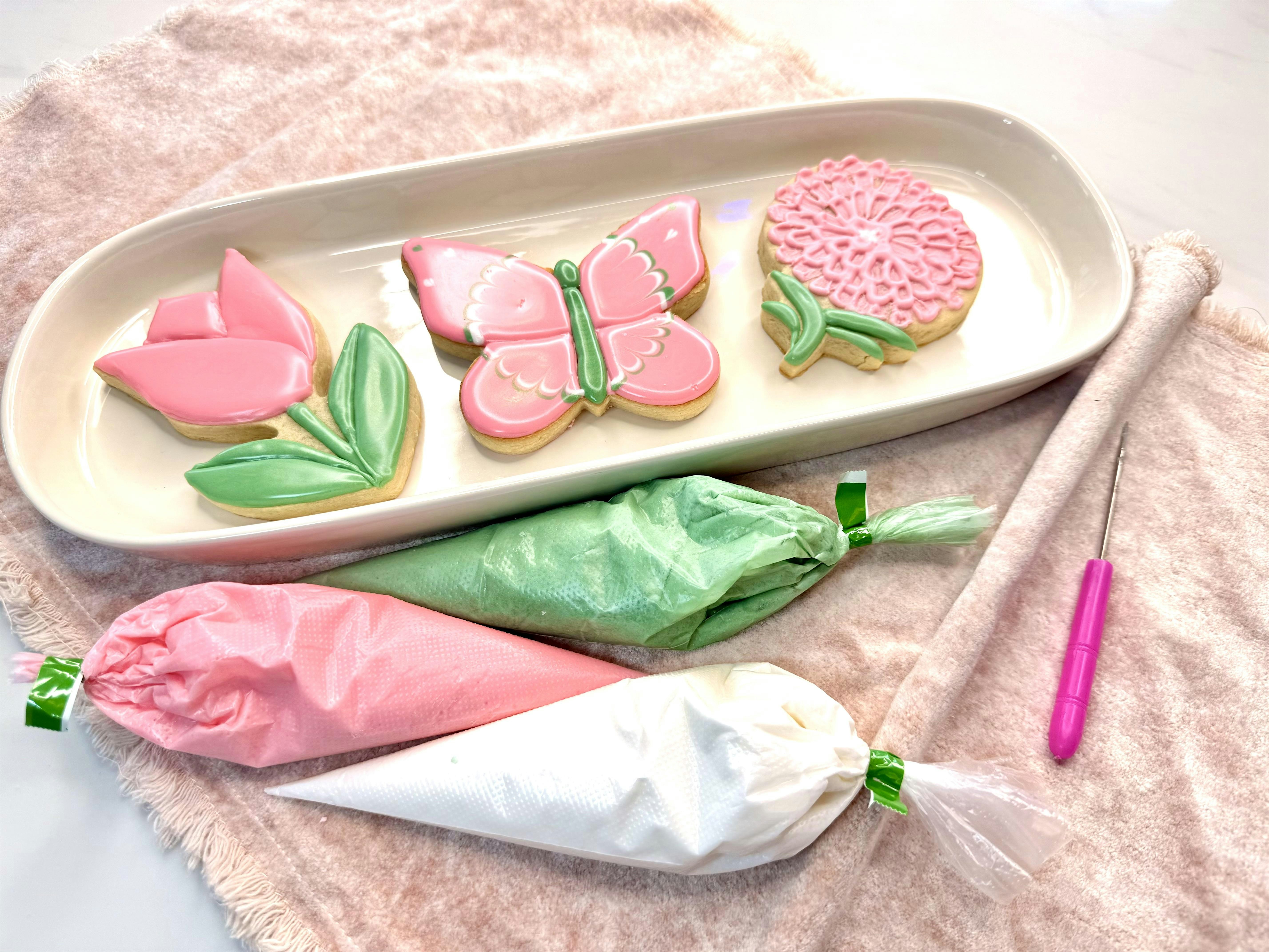 In this class, you’ll get 3 sugar cookies and royal icing colors to decorate your Spring Time cookie set!