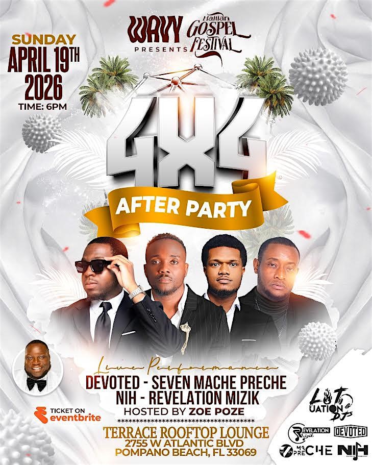 by admin13Feb WAVY’s 4×4 Haitian Gospel Fest After Party at Terrace Rooftop Lounge – Pompano Beach, FL WAVY’s 4×4 Haitian Gospel Fest After Party at Terrace Rooftop Lounge – Pompano Beach, FL 1 1 people viewed this event. Join us for an unforgettable evening of worship, culture, and celebration at WAVY, in collaboration with Haitian Gospel Fest. Tickets-RSVP Link Date And Time Sunday, April 19th, 2026 10:00 PM (PST) Venue Terrace Rooftop Lounge Location 2755 West Atlantic Boulevard, Pompano Beach, FL 33069 Event Types Party or Social Gathering Event Category Florida Share With Friends Facebook Twitter Linkedin Xing Pinterest Share This Post: