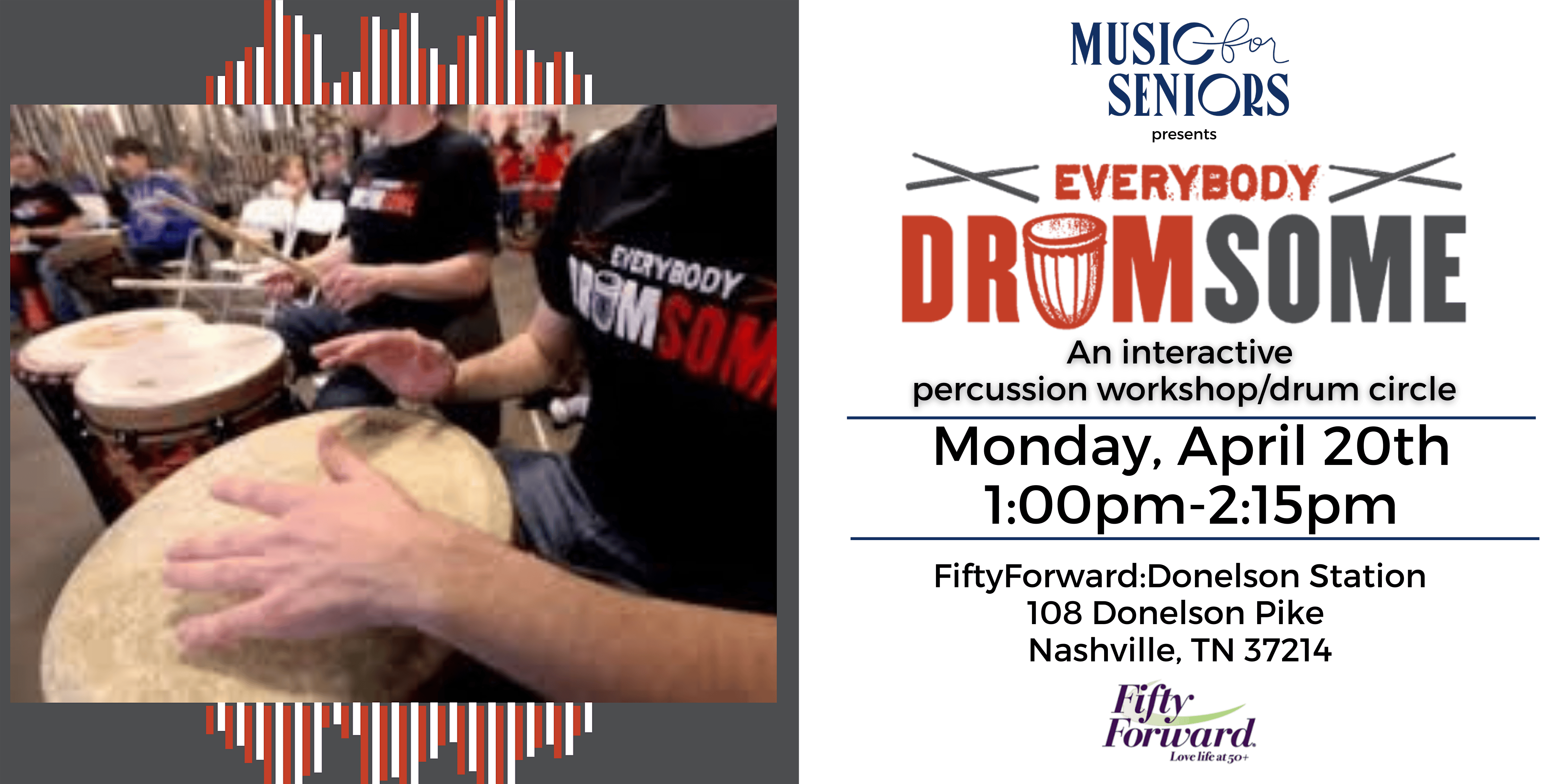 by admin27Feb Music for Seniors Interactive Drum Circle at FiftyForward Donelson Station – Nashville, TN Music for Seniors Interactive Drum Circle at FiftyForward Donelson Station – Nashville, TN 2 2 people viewed this event. Interactive Drum Circle/Workshop w/ Teaching Artist, Ross Lester Tickets-RSVP Link Date And Time Monday, April 20th, 2026 @ 01:00 PM Location 108 Donelson Pike, Nashville, TN 37214 Event Types Music Event Category NashvilleTennessee Share With Friends Facebook Twitter Linkedin Xing Pinterest Share This Post: