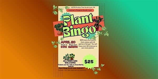 by admin14Feb Plant Bingo at South Lyon Aubree’s at Aubree’s Pizzeria & Grill – South Lyon, MI Plant Bingo at South Lyon Aubree’s at Aubree’s Pizzeria & Grill – South Lyon, MI 1 1 people viewed this event. Come and enjoy pizza, drinks, plants, and bingo! Tickets-RSVP Link Date And Time Monday, April 20th, 2026 10:00 PM (PST) Venue Aubree's Pizzeria & Grill Location 21775 Pontiac Trail, South Lyon, MI 48178 Event Types Food & Drink Event Category Michigan Share With Friends Facebook Twitter Linkedin Xing Pinterest Share This Post: