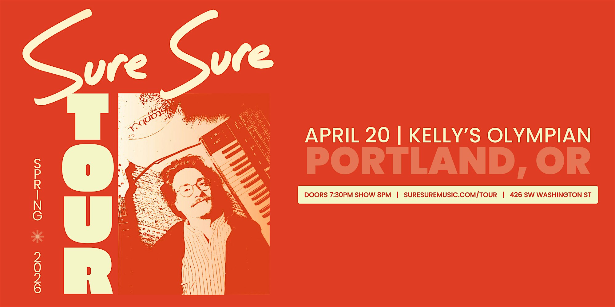 by admin24Feb SURE SURE w TBA at Kelly’s Olympian – Portland, OR SURE SURE w TBA at Kelly’s Olympian – Portland, OR 2 2 people viewed this event. Sure Sure returns to Portland with guests TBA Tickets-RSVP Link Date And Time Monday, April 20th, 2026 08:00 PM (PST) Venue Kelly's Olympian Location 426 Southwest Washington Street, Portland, OR 97204 Event Types Concert or PerformanceMusic Event Category OregonPortland Share With Friends Facebook Twitter Linkedin Xing Pinterest Share This Post:
