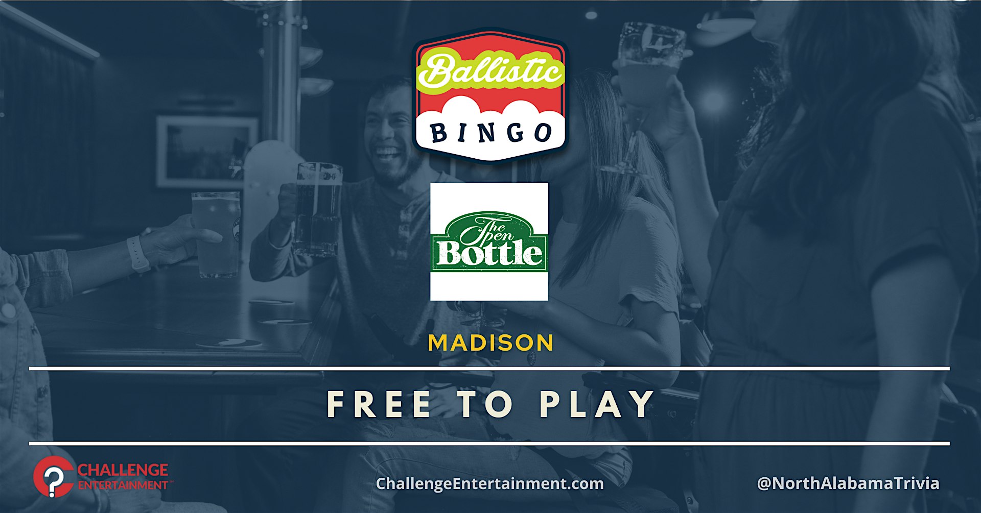 Weekly Ballistic Bingo Nights at The Open Bottle – Madison at The Open Bottle – Madison, AL – Huntsville, AL Weekly Ballistic Bingo Nights at The Open Bottle – Madison at The Open Bottle – Madison, AL – Huntsville, AL 3 3 people viewed this event. Ballastic Bingo Nights at The Open Bottle – Madison Tickets-RSVP Link Register for event Date And Time Monday, April 20th, 2026 @ 07:00 PM Location 7061 Highway 72 West, Huntsville, AL 35806 Event Types Food & DrinkParty or Social Gathering Event Category AlabamaHuntsville Share With Friends Facebook Twitter Linkedin Xing Pinterest