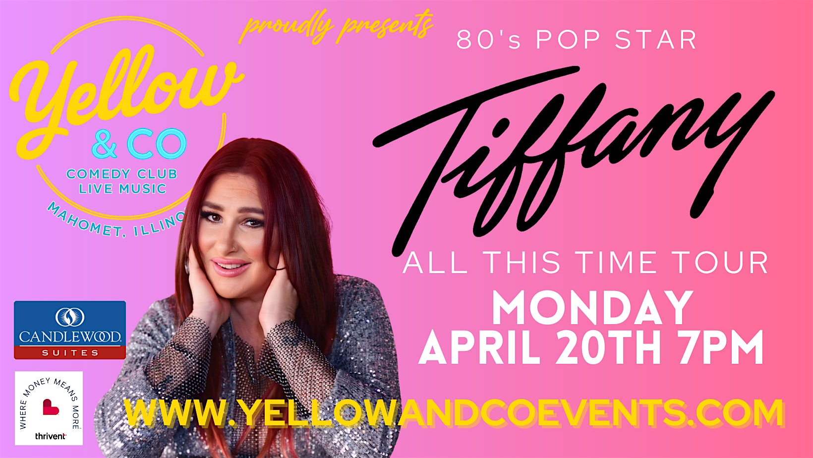 by admin27Feb Yellow and Co. presents Pop Star Tiffany in the All This Time Tour! at Yellow & Co. – Mahomet, IL Yellow and Co. presents Pop Star Tiffany in the All This Time Tour! at Yellow & Co. – Mahomet, IL 3 3 people viewed this event. We welcome 80s Pop Star Tiffany! Know for her record breaking single “I Think We Are Alone Now’! Tickets-RSVP Link Date And Time Monday, April 20th, 2026 @ 07:00 PM Location 1830 Patton Drive, Mahomet, IL 61853 Event Types Concert or PerformanceMusic Event Category Illinois Share With Friends Facebook Twitter Linkedin Xing Pinterest Share This Post: