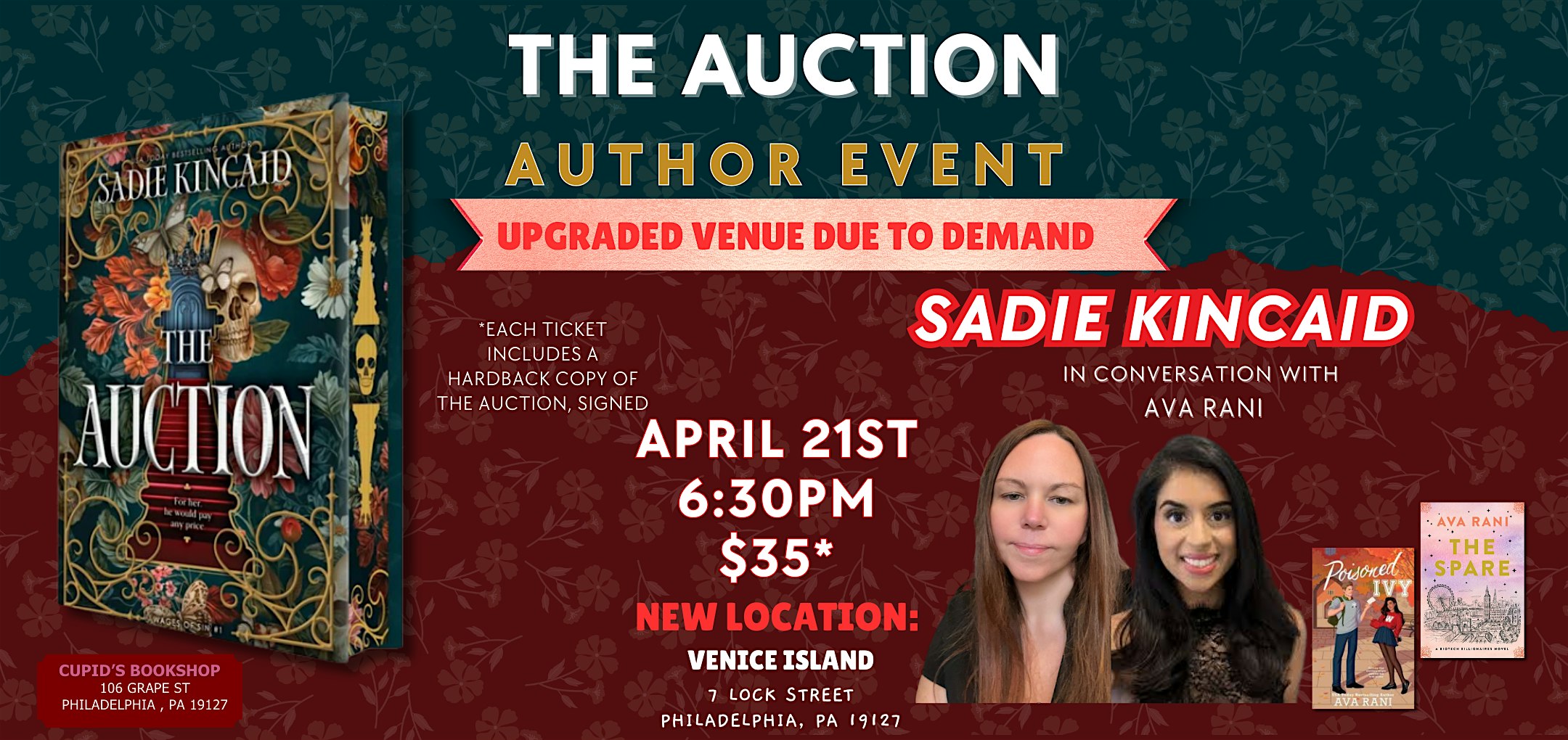 Join us at Cupid’s Bookshop with author Sadie Kincaid in conversation with Ava Rani as she discusses her book The Auction.
