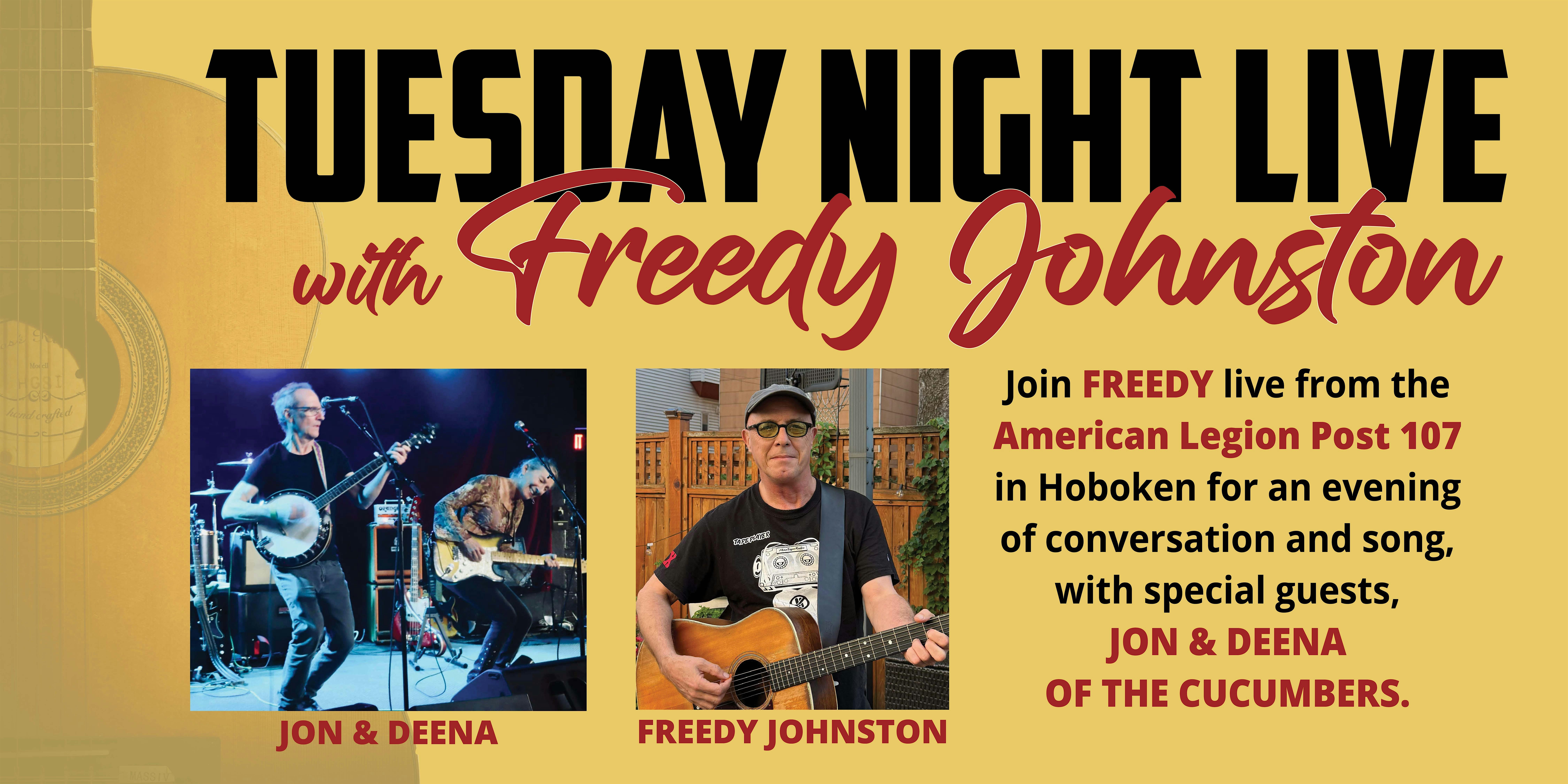by admin27Feb Freedy Johnston’s Tues. Night Live w/Jon & Deena at Hoboken American Legion Post 107 – Hoboken, NJ Freedy Johnston’s Tues. Night Live w/Jon & Deena at Hoboken American Legion Post 107 – Hoboken, NJ 2 2 people viewed this event. Freedy Johnston’s Tues. Night Live with special guests Jon & Deena of the Cucumbers, April 21st at the American Legion Post 107 in Hoboken. Tickets-RSVP Link Date And Time Tuesday, April 21st, 2026 @ 08:00 PM Location 308 2nd Street, Hoboken, NJ 7030 Event Types Concert or PerformanceMusic Event Category New Jersey Share With Friends Facebook Twitter Linkedin Xing Pinterest Share This Post: