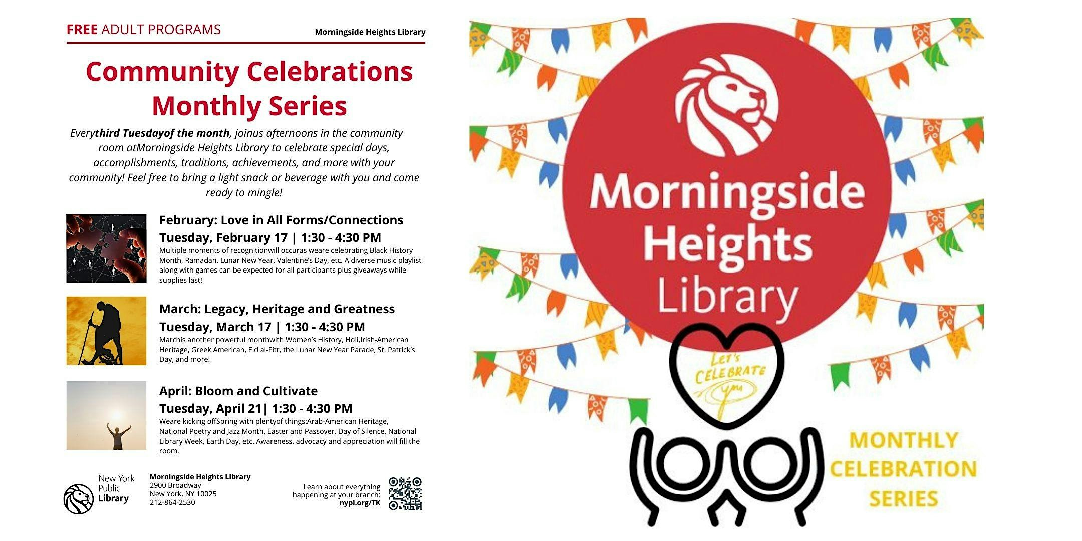 by admin13Feb Monthly Community Celebrations at Morningside Heights Library – New York, NY Monthly Community Celebrations at Morningside Heights Library – New York, NY 3 3 people viewed this event. Every third Tuesday of the month, join us afternoons in the community room at Morningside Heights Library to celebrate special days and you! Tickets-RSVP Link Date And Time Tuesday, April 21st, 2026 05:00 PM (PST) Venue Morningside Heights Library Location 2900 Broadway, New York, NY 10025 Event Types Community & CultureParty or Social Gathering Event Category New YorkNew York City Share With Friends Facebook Twitter Linkedin Xing Pinterest Share This Post: