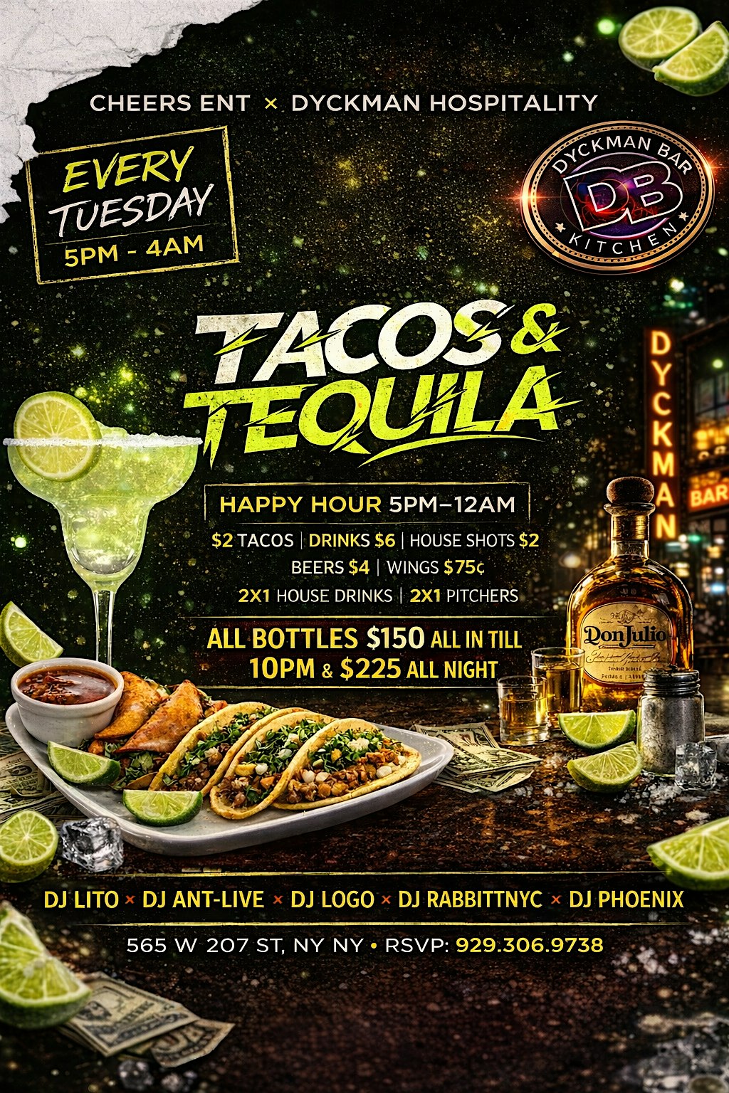 TACOS & TEQUILA at Dyckman Bar & Kitchen – New York, NY TACOS & TEQUILA at Dyckman Bar & Kitchen – New York, NY 2 2 people viewed this event. Get ready to spice up your night with killer tacos and smooth tequila vibes! Tickets-RSVP Link Register for event Date And Time Tuesday, April 21st, 2026 @ 05:00 PM Location 565 West 207th Street, New York, NY 10034 Event Types Food & DrinkParty or Social Gathering Event Category New YorkNew York City Share With Friends Facebook Twitter Linkedin Xing Pinterest