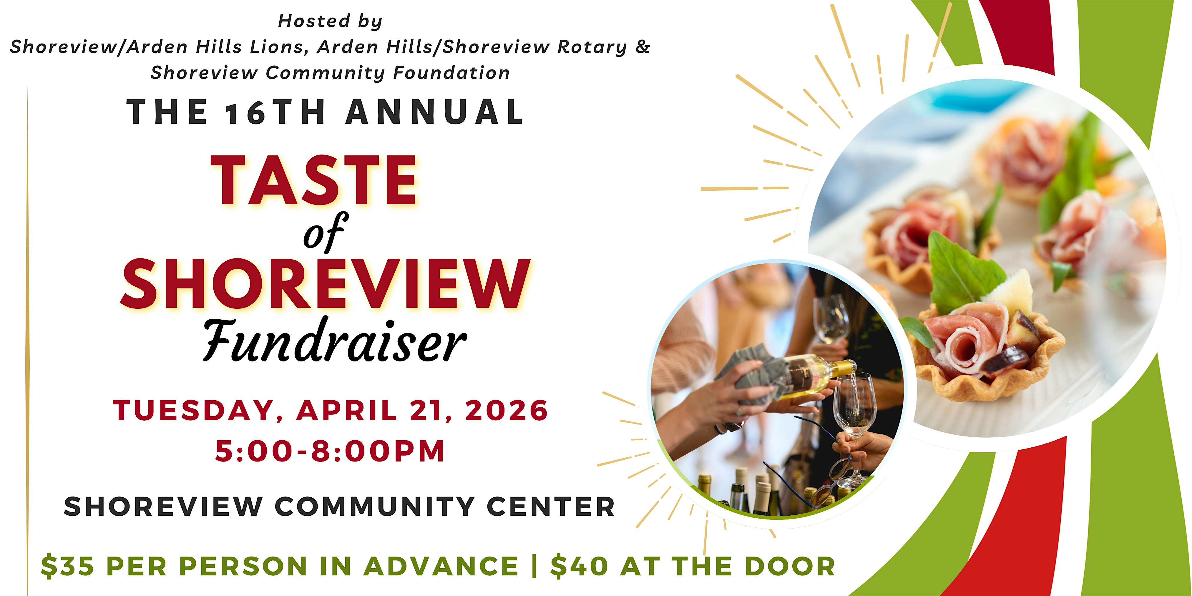 by admin13Feb Taste of Shoreview 2026 at Shoreview Community Center – Shoreview, MN Taste of Shoreview 2026 at Shoreview Community Center – Shoreview, MN 2 2 people viewed this event. A fun evening food and wine/beer samples from local restaurants, auction and more! Proceeds support the 2026 Slice of Shoreview. Tickets-RSVP Link Date And Time Tuesday, April 21st, 2026 10:00 PM (PST) Venue Shoreview Community Center Location 4580 Victoria Street North, Shoreview, MN 55126 Event Types Food & DrinkParty or Social Gathering Event Category Minnesota Share With Friends Facebook Twitter Linkedin Xing Pinterest Share This Post: