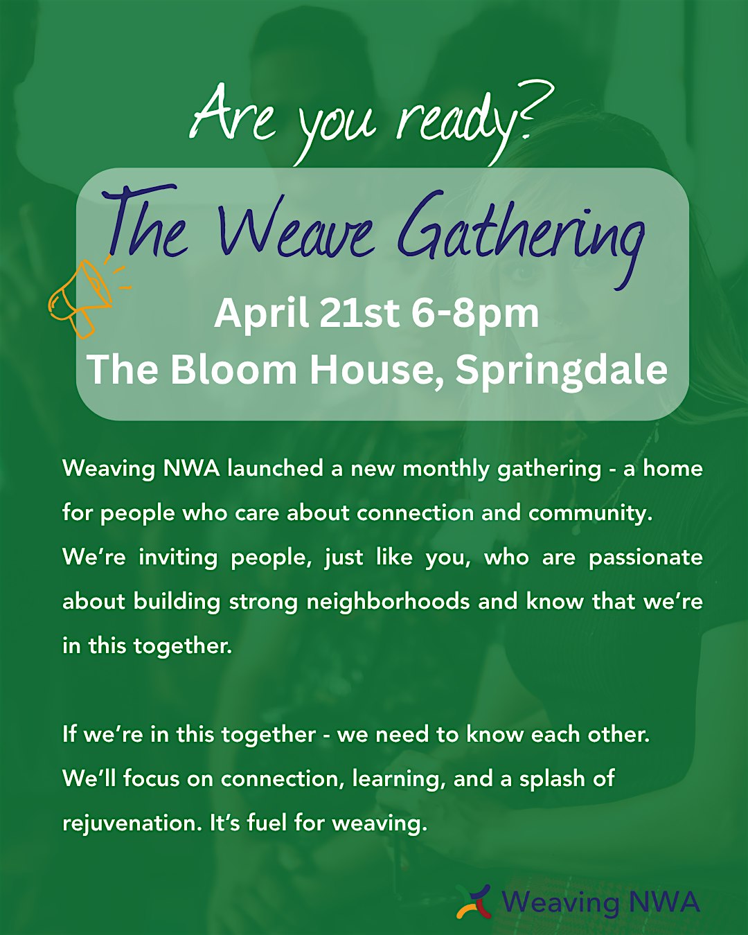 We invite you to the April Weave Gathering- a monthly convening of NWA Weavers. Come join alongside other weavers who care deeply about community and connection in Northwest Arkansas.