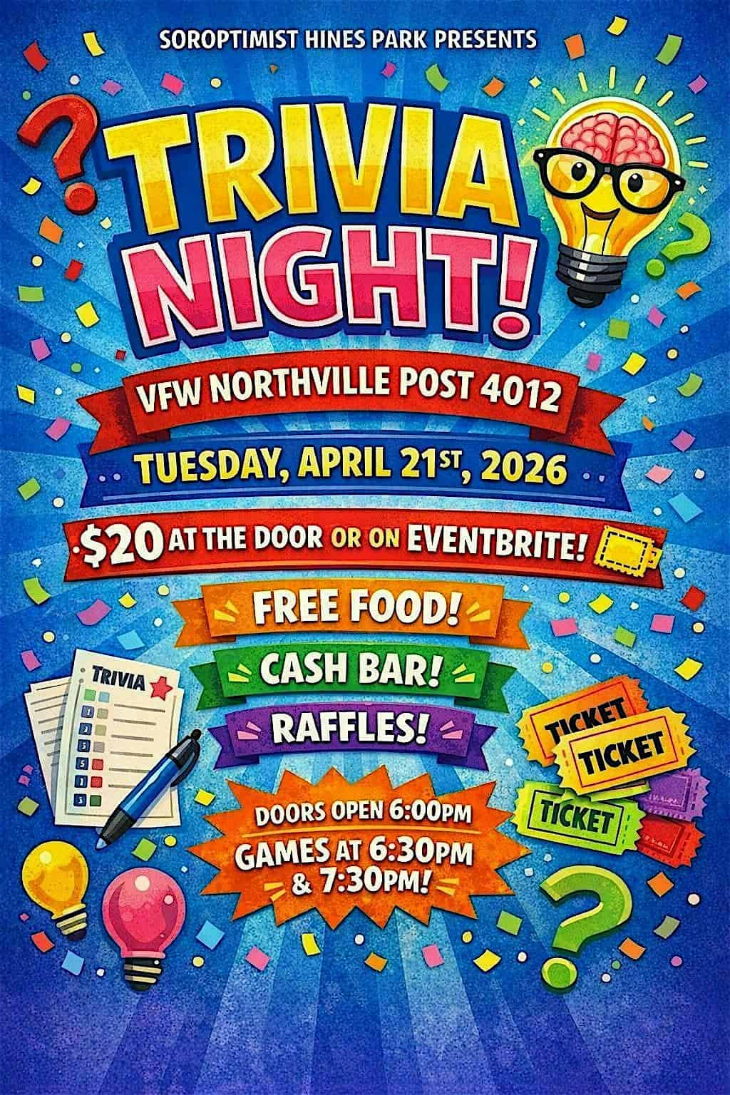 by admin23Feb Trivia Night with Soroptimist Hines Park at Veterans of Foreign Wars Northville Post 4012 – Northville, MI Trivia Night with Soroptimist Hines Park at Veterans of Foreign Wars Northville Post 4012 – Northville, MI 2 2 people viewed this event. Come enjoy 2 games of Trivia with us on Tuesday, April 21st! Free food, cash bar, and raffle prizes! Tickets-RSVP Link Date And Time Tuesday, April 21st, 2026 06:00 PM (PST) Venue Veterans of Foreign Wars Northville Post 4012 Location 438 South Main Street, Northville, MI 48167 Event Types Charity & CausesParty or Social Gathering Event Category Michigan Share With Friends Facebook Twitter Linkedin Xing Pinterest Share This Post: