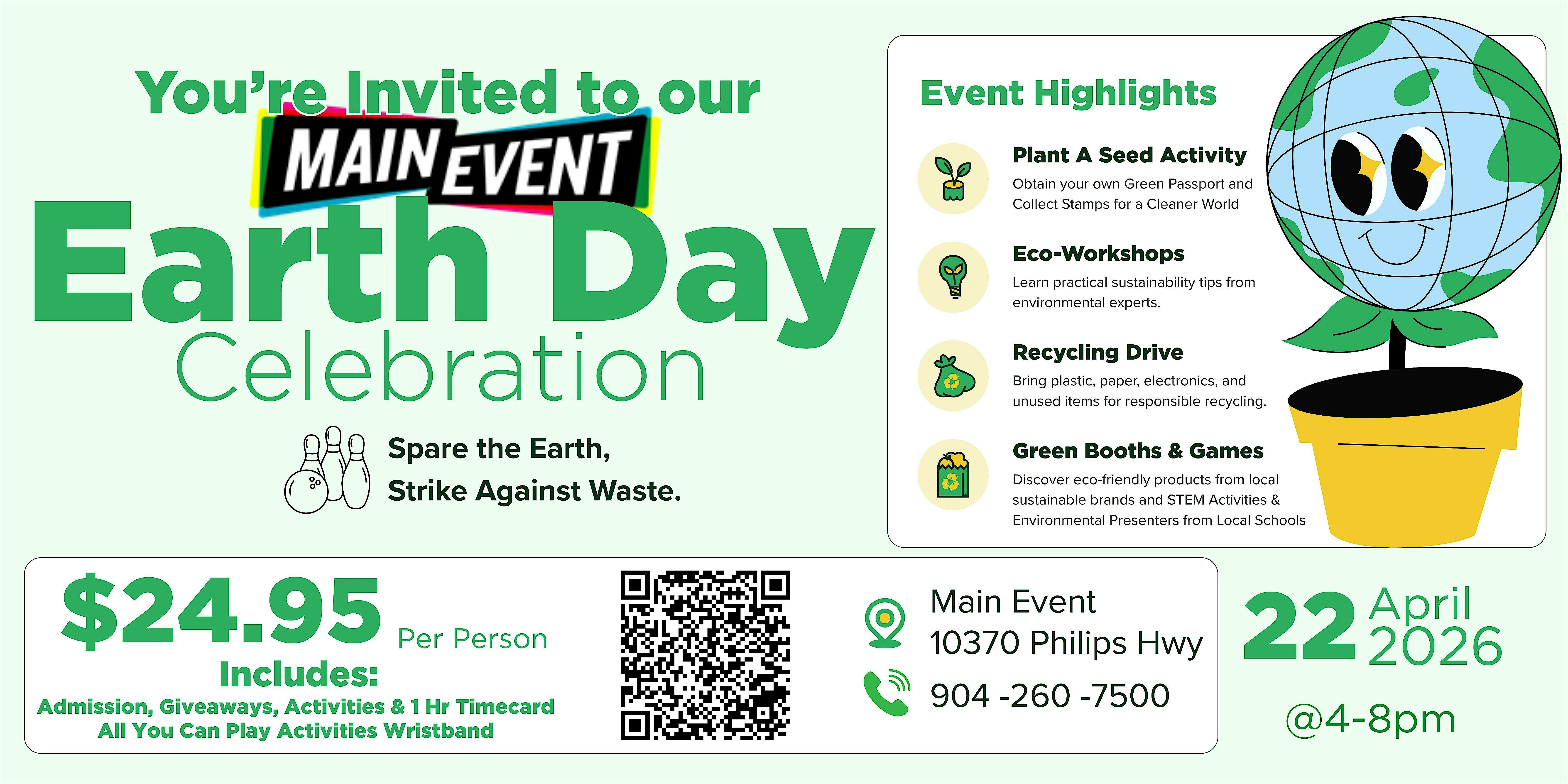 by admin13Feb Earth Day Celebration at Main Event at Main Event Jacksonville – Jacksonville, FL Earth Day Celebration at Main Event at Main Event Jacksonville – Jacksonville, FL 1 1 people viewed this event. High energy, family friendly STEM experience hosted at Main Event. Tickets-RSVP Link Date And Time Wednesday, April 22nd, 2026 08:00 PM (PST) Venue Main Event Jacksonville Location 10370 Philips Highway, Jacksonville, FL 32256 Event Types Community & CultureParty or Social Gathering Event Category FloridaJacksonville Share With Friends Facebook Twitter Linkedin Xing Pinterest Share This Post: