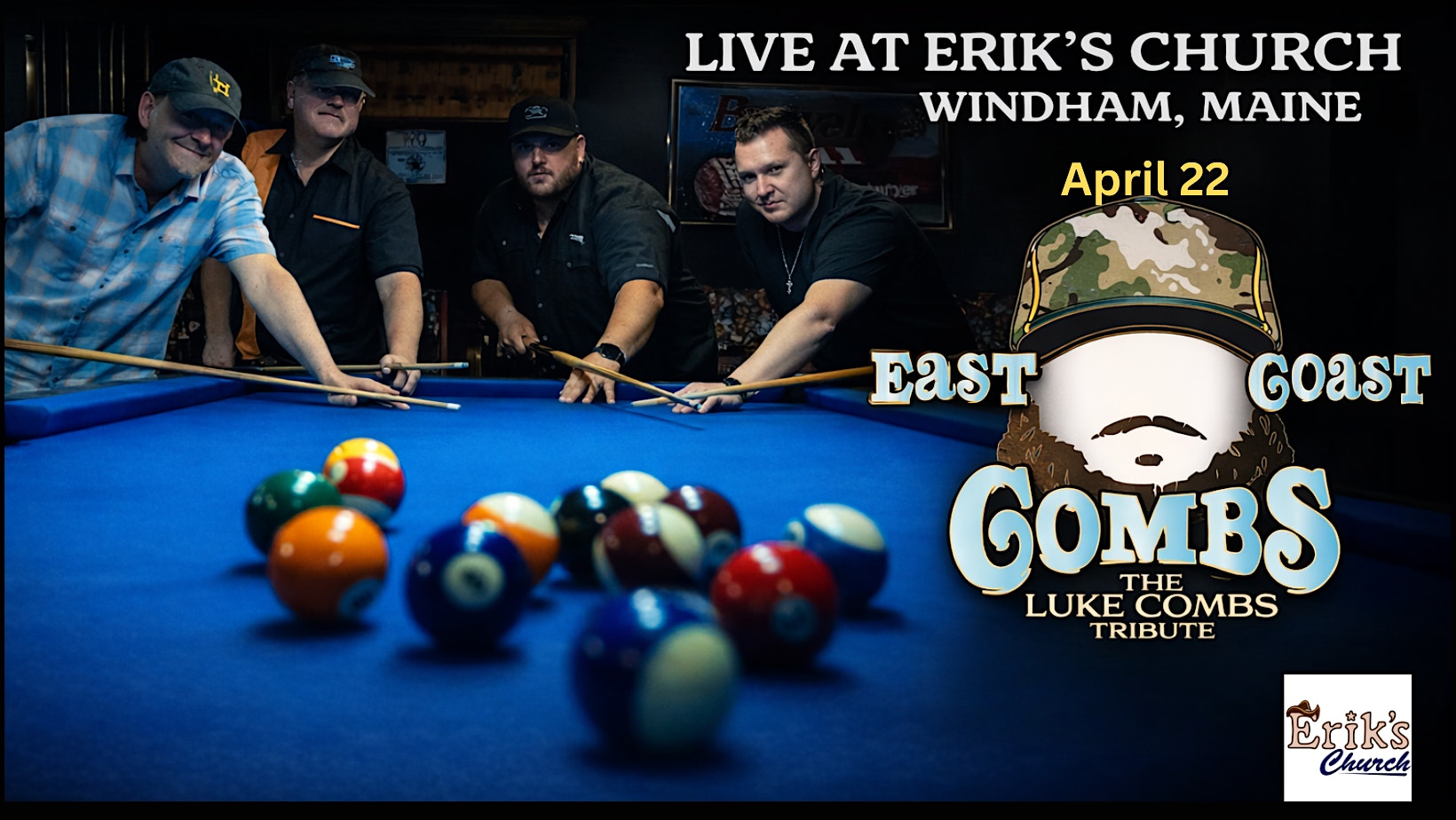 East Coast Combs at Eriks Church – Windham, ME East Coast Combs at Eriks Church – Windham, ME 5 5 people viewed this event. NEW ENGLAND’S LUKE COMBS TRIBUTE BAND brings you a one of a kind Luke Combs Experience! Tickets-RSVP Link Register for event Date And Time Wednesday, April 22nd, 2026 @ 07:00 PM Location Eriks Church 824 Roosevelt Trail, Windham, ME 4062 Event Types Concert or PerformanceMusic Event Category Maine Share With Friends Facebook Twitter Linkedin Xing Pinterest