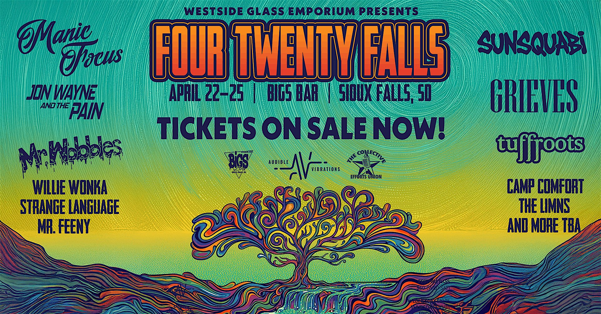 by admin27Feb Four Twenty Falls 2026 at Bigs Bar – Sioux Falls, SD Four Twenty Falls 2026 at Bigs Bar – Sioux Falls, SD 2 2 people viewed this event. We are beyond stoked to announce the return of Four Twenty Falls, April 22–25 at Bigs Bar! Tickets-RSVP Link Date And Time Wednesday, April 22nd, 2026 @ 07:00 PM Location 3110 West 12th Street, Sioux Falls, SD 57104 Event Types Concert or PerformanceMusic Event Category South Dakota Share With Friends Facebook Twitter Linkedin Xing Pinterest Share This Post: