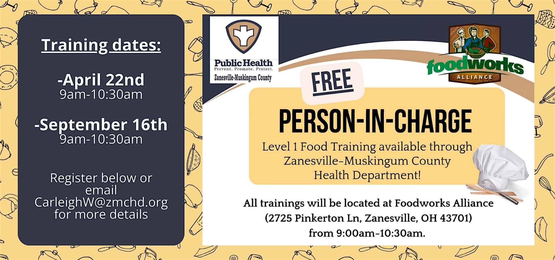 by admin14Feb FREE Level 1 Food Safety Training at 2725 Pinkerton Ln – Zanesville, OH FREE Level 1 Food Safety Training at 2725 Pinkerton Ln – Zanesville, OH 1 1 people viewed this event. FREE in person Level 1 Food Safety Training brought to you by the Zanesville Muskingum County Health Department Tickets-RSVP Link Date And Time Wednesday, April 22nd, 2026 01:00 PM (PST) Venue 2725 Pinkerton Ln Location 2725 Pinkerton Lane, Zanesville, OH 43701 Event Types Food & Drink Event Category Ohio Share With Friends Facebook Twitter Linkedin Xing Pinterest Share This Post: