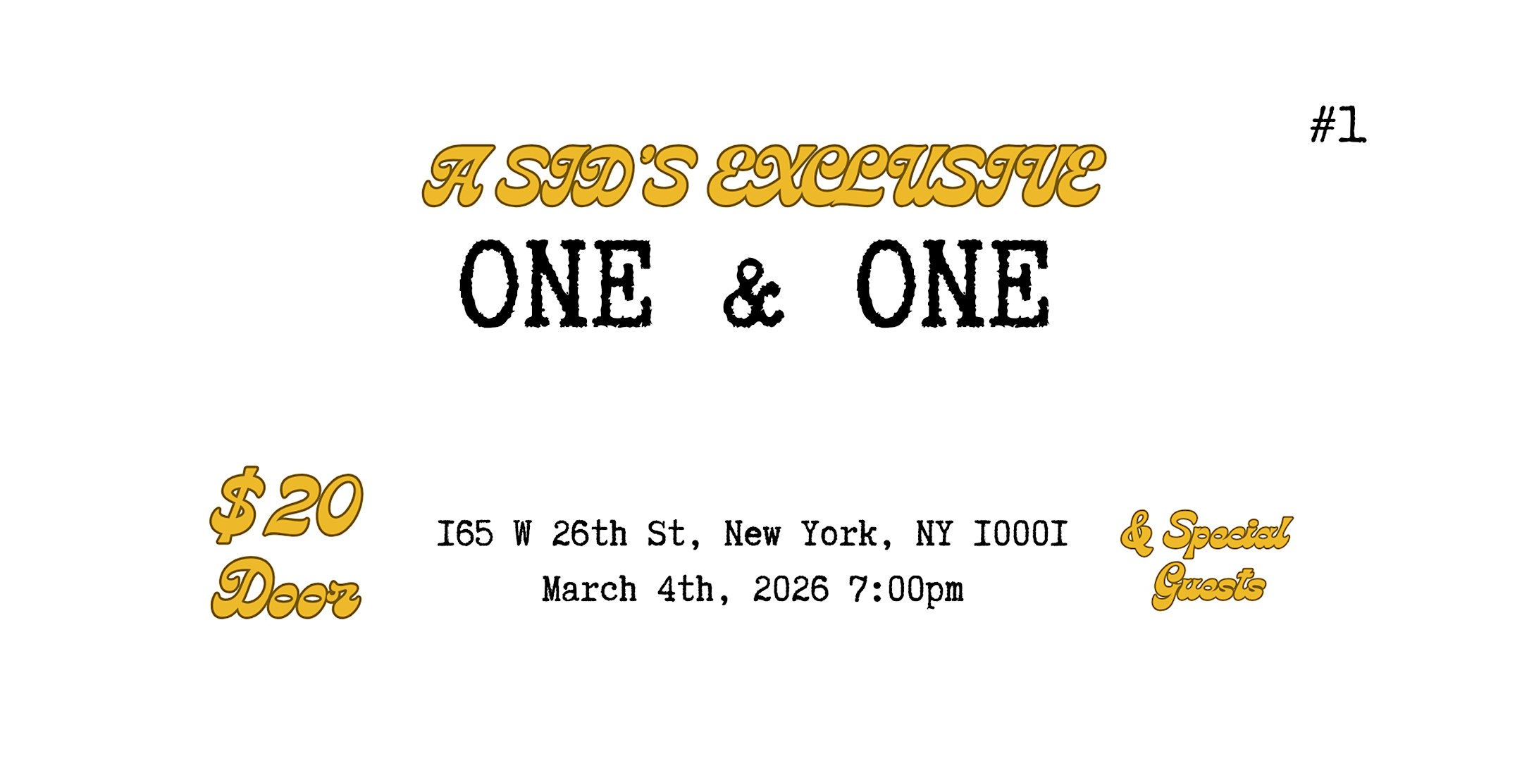 by admin24Feb One & One at Sid Gold’s Request Room – New York, NY One & One at Sid Gold’s Request Room – New York, NY 1 1 people viewed this event. Got a new one? Got an old one? One in yr mind? SIDS has got one for you! “ONE & ONE” 1 cover/1 original A Salon of Artists Tickets-RSVP Link Date And Time Wednesday, April 22nd, 2026 07:00 PM (PST) Venue Sid Gold's Request Room Location 165 West 26th Street, New York, NY 10001 Event Types Concert or PerformanceMusic Event Category New YorkNew York City Share With Friends Facebook Twitter Linkedin Xing Pinterest Share This Post: