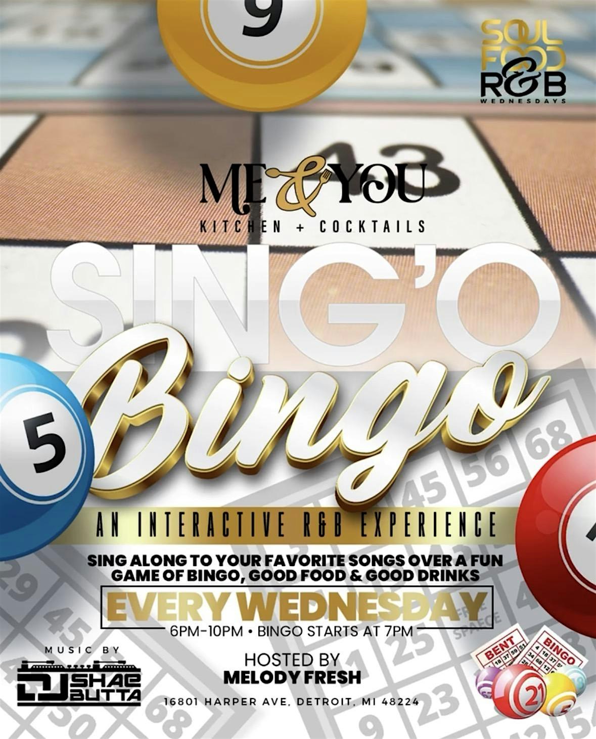 by admin13Feb Singo Bingo at ME & YOU Kitchen + Cocktails – Detroit, MI Singo Bingo at ME & YOU Kitchen + Cocktails – Detroit, MI 2 2 people viewed this event. Get ready to sing your heart out playing Singo Bingo – a musical twist on the classic game! Tickets-RSVP Link Date And Time Wednesday, April 22nd, 2026 11:00 PM (PST) Venue ME & YOU Kitchen + Cocktails Location 16801 Harper Avenue, Detroit, MI 48224 Event Types Music Event Category DetroitMichigan Share With Friends Facebook Twitter Linkedin Xing Pinterest Share This Post: