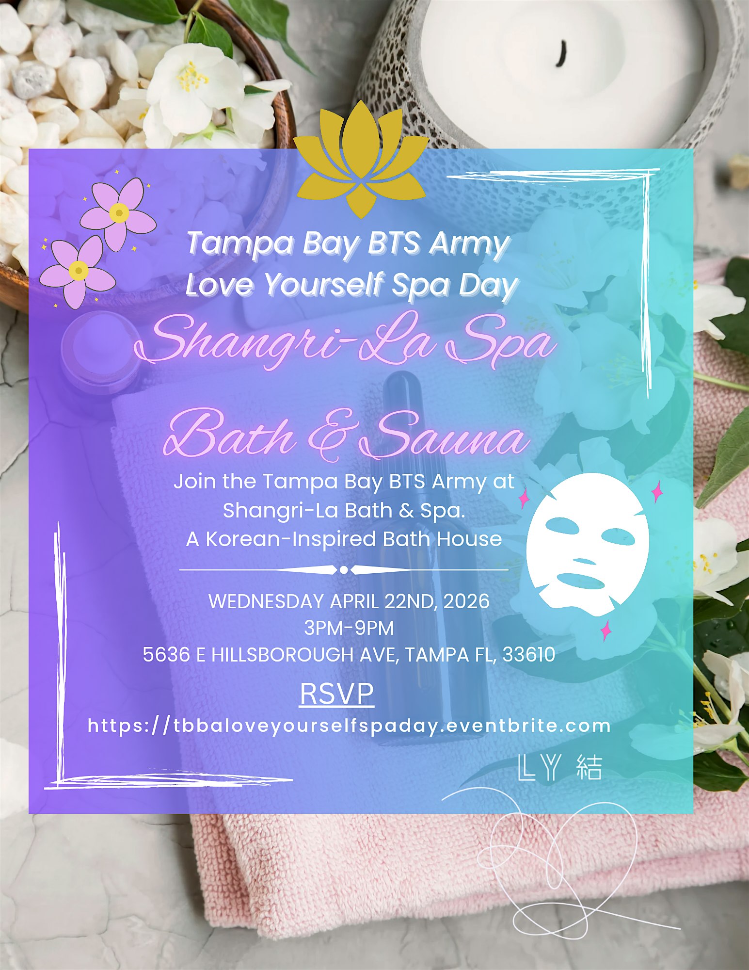 by admin27Feb Tampa Bay BTS Army Love Yourself Spa Day at Shangri-La Bath & Sauna – Tampa, FL Tampa Bay BTS Army Love Yourself Spa Day at Shangri-La Bath & Sauna – Tampa, FL 2 2 people viewed this event. Get ready to pamper yourself like a K-pop star at our Tampa Bay BTS ARMY Love Yourself Spa Day – relaxation, beauty, and fun await! Tickets-RSVP Link Date And Time Wednesday, April 22nd, 2026 @ 03:00 PM Location 5636 East Hillsborough Avenue, Tampa, FL 33610 Event Types Party or Social Gathering Event Category FloridaTampa Share With Friends Facebook Twitter Linkedin Xing Pinterest Share This Post: