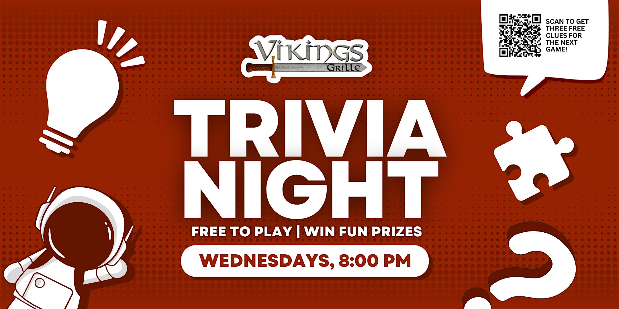 Topeka Trivia Night | Vikings Grille at Vikings Grille Topeka – Topeka, KS Topeka Trivia Night | Vikings Grille at Vikings Grille Topeka – Topeka, KS 4 4 people viewed this event. Free live trivia every Wednesday at 8pm at Vikings Grille in Topeka! Free to play, and top teams win gift card prizes! Tickets-RSVP Link Register for event Date And Time Wednesday, April 22nd, 2026 @ 08:00 PM Location Vikings Grille Topeka 4731 Northwest Hunters Ridge Circle, Topeka, KS 66618 Event Types Party or Social Gathering Event Category Kansas Share With Friends Facebook Twitter Linkedin Xing Pinterest