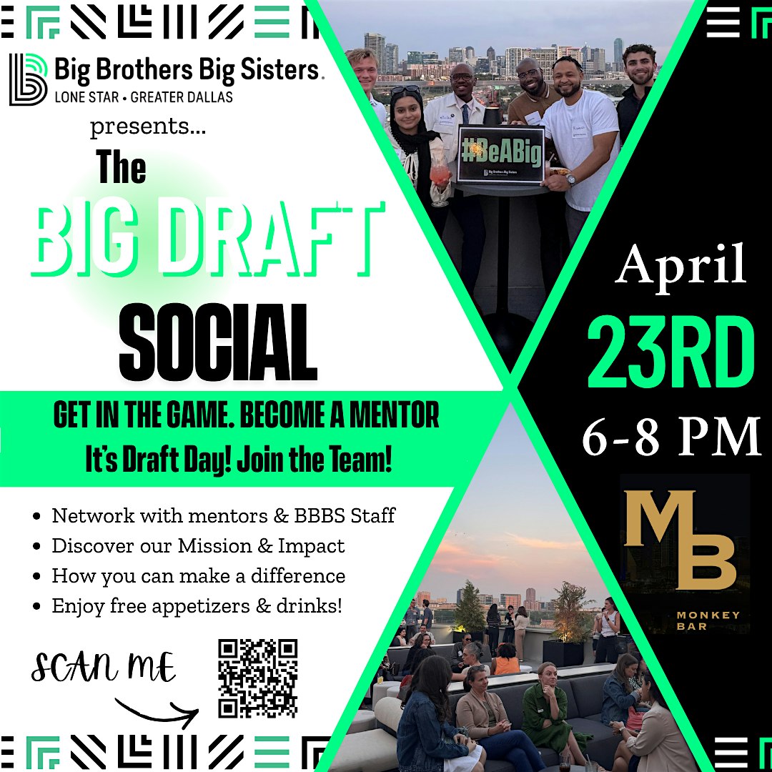 Come join us for Big Brothers Big Sisters’ next BIG Social at the Monkey Bar on 9 rooftop in Dallas on Thursday, April 23rd, 2026 from 6-8 PM!