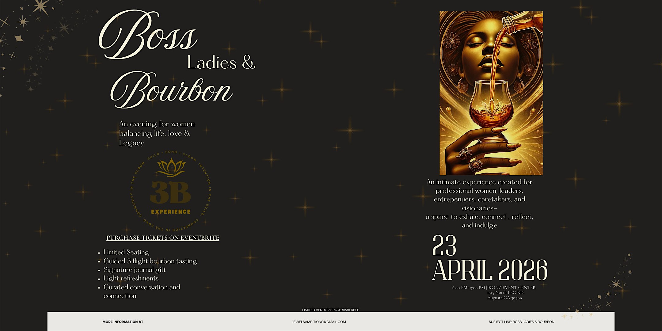 by admin13Feb Boss Ladies & Bourbon at 1515 N Leg Rd – Augusta, GA Boss Ladies & Bourbon at 1515 N Leg Rd – Augusta, GA 1 1 people viewed this event. An intentional space for women balancing ambition, business, family & legacy. The 3B-Experience. Build. Bond. Bloom. Tickets-RSVP Link Date And Time Thursday, April 23rd, 2026 10:00 PM (PST) Venue 1515 N Leg Rd Location 1515 North Leg Road, Augusta, GA 30909 Event Types Party or Social Gathering Event Category AugustaGeorgia Share With Friends Facebook Twitter Linkedin Xing Pinterest Share This Post: