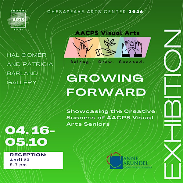 by admin23Feb Gallery Reception for Growing Forward: AACPS Visual Arts Seniors Exhibition at Chesapeake Arts Center – Brooklyn Park, MD Gallery Reception for Growing Forward: AACPS Visual Arts Seniors Exhibition at Chesapeake Arts Center – Brooklyn Park, MD 2 2 people viewed this event. Showcasing the Creative Success of AACPS Visual Arts Seniors Exhibition at Chesapeake Arts Center Tickets-RSVP Link Date And Time Thursday, April 23rd, 2026 05:00 PM (PST) Venue Chesapeake Arts Center Location 194 Hammonds Lane, Brooklyn Park, MD 21225 Event Types Party or Social GatheringPerforming & Visual Arts Event Category Maryland Share With Friends Facebook Twitter Linkedin Xing Pinterest Share This Post: