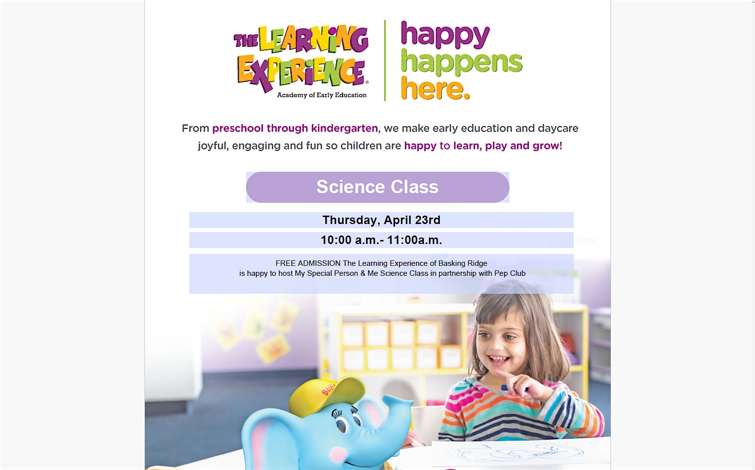 My Special Person & Me Science Class at The Learning Experience – Basking Ridge – Bernards, NJ My Special Person & Me Science Class at The Learning Experience – Basking Ridge – Bernards, NJ 2 2 people viewed this event. My Special Person & Me Science Class is a fun, hands-on experience where you will explore simple science experiments. Tickets-RSVP Link Register for event Date And Time Thursday, April 23rd, 2026 @ 10:00 AM Location The Learning Experience - Basking Ridge 188 Mount Airy Road, Bernards, NJ 7920 Event Types Class, Training, or Workshop Event Category New Jersey Share With Friends Facebook Twitter Linkedin Xing Pinterest
