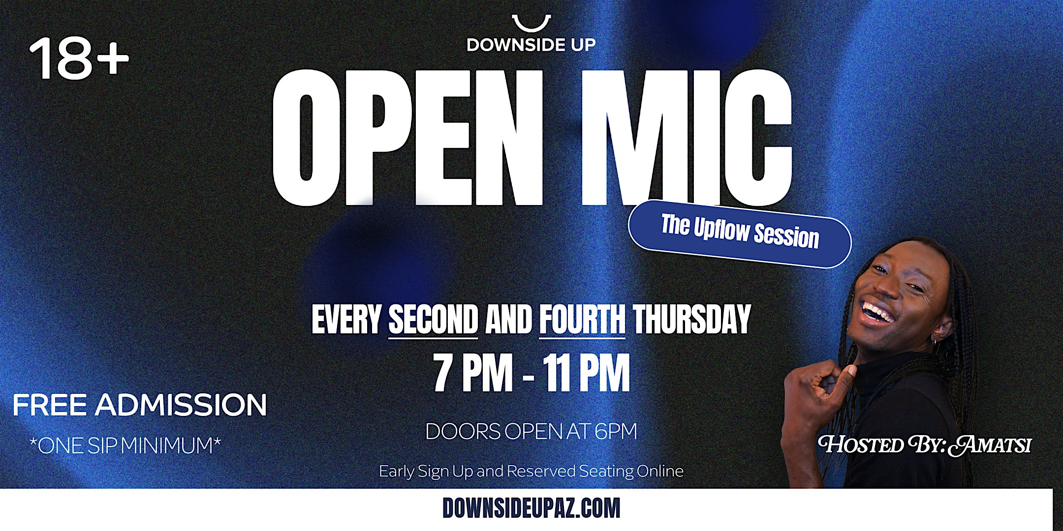 Open Mic: The Upflow Sessions at Downside Up – Phoenix, AZ Open Mic: The Upflow Sessions at Downside Up – Phoenix, AZ 3 3 people viewed this event. Join us for a night of sharing your talents and vibes at Open Mic: The Upflow Sessions – let’s flow together! Tickets-RSVP Link Register for event Date And Time Thursday, April 23rd, 2026 @ 07:00 PM Location Downside Up 12820 North 19th Avenue, Phoenix, AZ 85029 Event Types Concert or PerformancePerforming & Visual Arts Event Category ArizonaPhoenix Share With Friends Facebook Twitter Linkedin Xing Pinterest