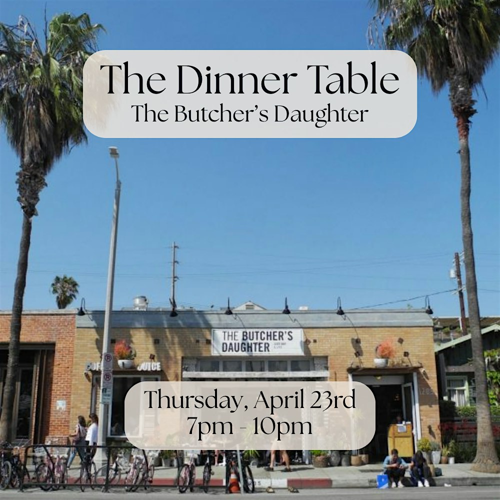 by admin24Feb The Dinner Table at The Butcher’s Daughter (Venice) at The Butcher’s Daughter – Los Angeles, CA The Dinner Table at The Butcher’s Daughter (Venice) at The Butcher’s Daughter – Los Angeles, CA 2 2 people viewed this event. A Plant Forward Dinner Party Where Strangers Become Friends. Join 15-20 guests at The Butcher’s Daughter on Abbot Kinney Tickets-RSVP Link Date And Time Thursday, April 23rd, 2026 07:00 PM (PST) Venue The Butcher's Daughter Location 1205 Abbot Kinney Boulevard, Los Angeles, CA 90291 Event Types Food & Drink Event Category CaliforniaLos Angeles Share With Friends Facebook Twitter Linkedin Xing Pinterest Share This Post: