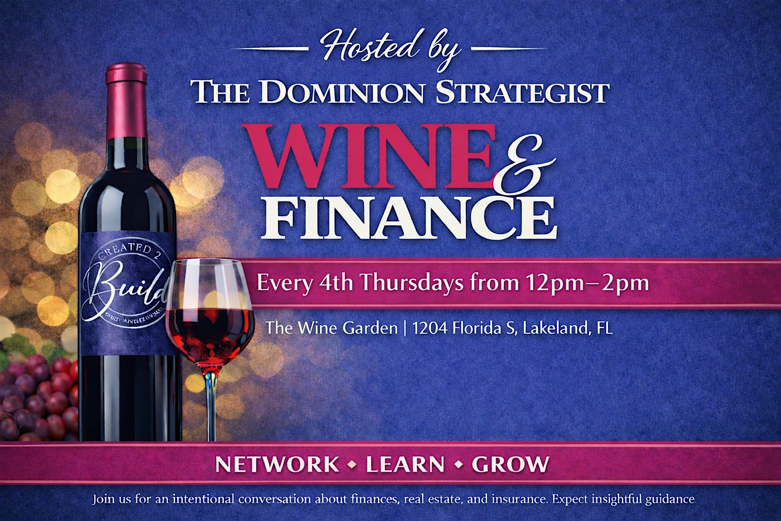 Wine and Finance at The Wine Garden – Lakeland, FL Wine and Finance at The Wine Garden – Lakeland, FL 1 1 people viewed this event. Wine & Finance is an elevated networking experience connecting visionaries through conversation, insight, and meaningful relationships Tickets-RSVP Link Register for event Date And Time Thursday, April 23rd, 2026 @ 12:00 PM Location 1204 Florida Avenue South, Lakeland, FL 33803 Event Types Food & DrinkMeeting or Networking Event Event Category Florida Share With Friends Facebook Twitter Linkedin Xing Pinterest