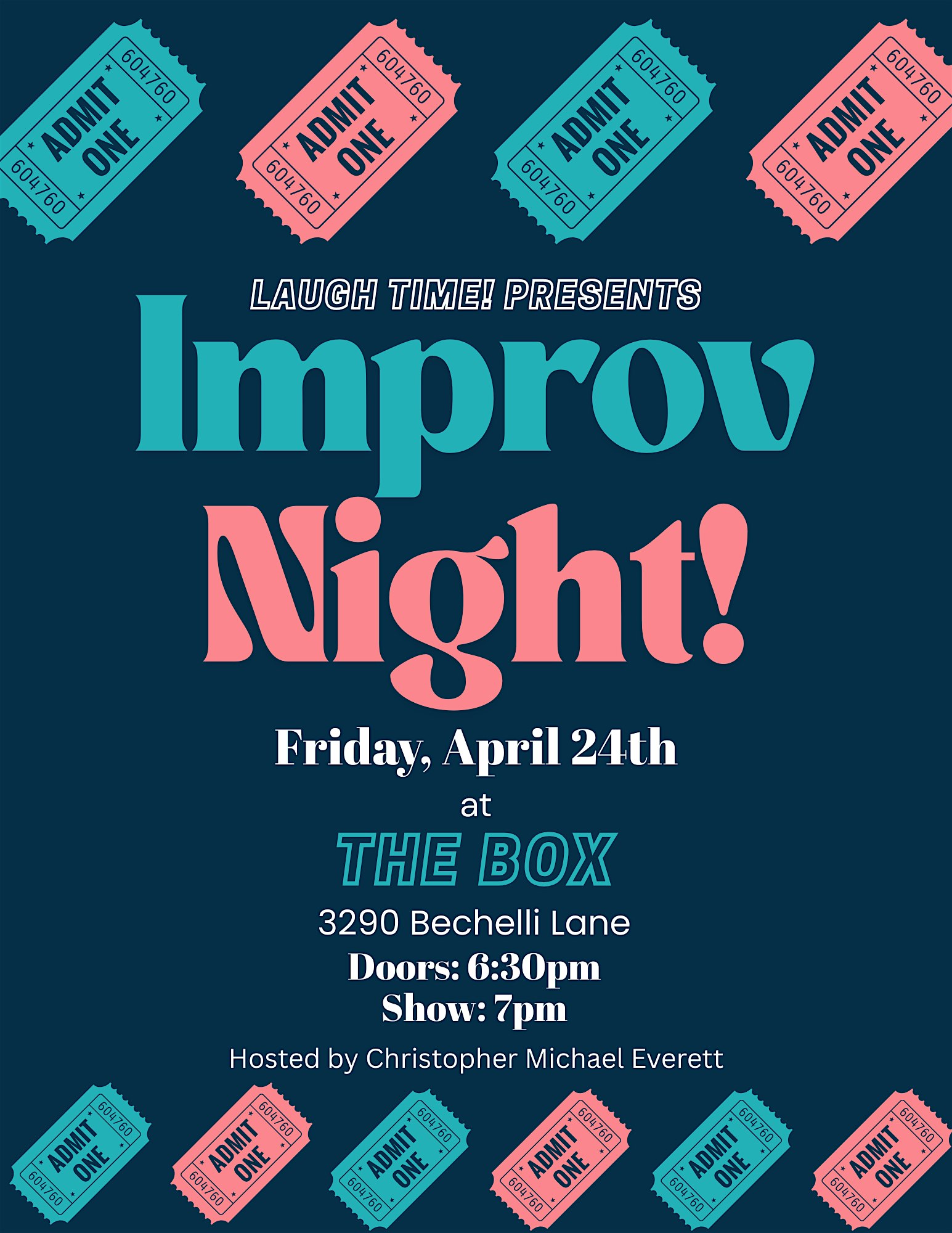 April Improv Show! at The Box – Redding, CA April Improv Show! at The Box – Redding, CA 3 3 people viewed this event. Join us for an evening of laughter & improvised fun!!! Tickets-RSVP Link Register for event Date And Time Friday, April 24th, 2026 @ 07:00 PM Location The Box 3290 Bechelli Lane, Redding, CA 96002 Event Types Concert or PerformancePerforming & Visual Arts Event Category California Share With Friends Facebook Twitter Linkedin Xing Pinterest