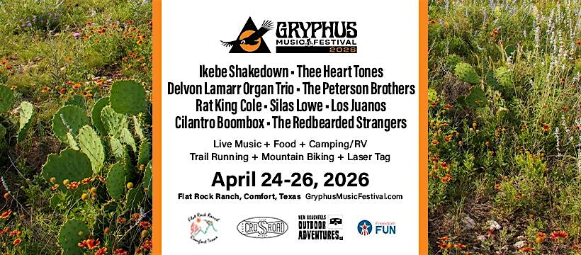 by admin27Feb Gryphus Music Festival at Flat Rock Ranch (Mountain Biking Trails) – Comfort, TX Gryphus Music Festival at Flat Rock Ranch (Mountain Biking Trails) – Comfort, TX 2 2 people viewed this event. Gryphus Music Festival is a one-weekend Texas music and outdoor festival with live music, mountain biking, camping, food, and laser tag. Tickets-RSVP Link Date And Time Friday, April 24th, 2026 @ 04:00 PM Location Flat Rock Creek Road, Comfort, TX 78013 Event Types Festival or FairMusic Event Category Texas Share With Friends Facebook Twitter Linkedin Xing Pinterest Share This Post:
